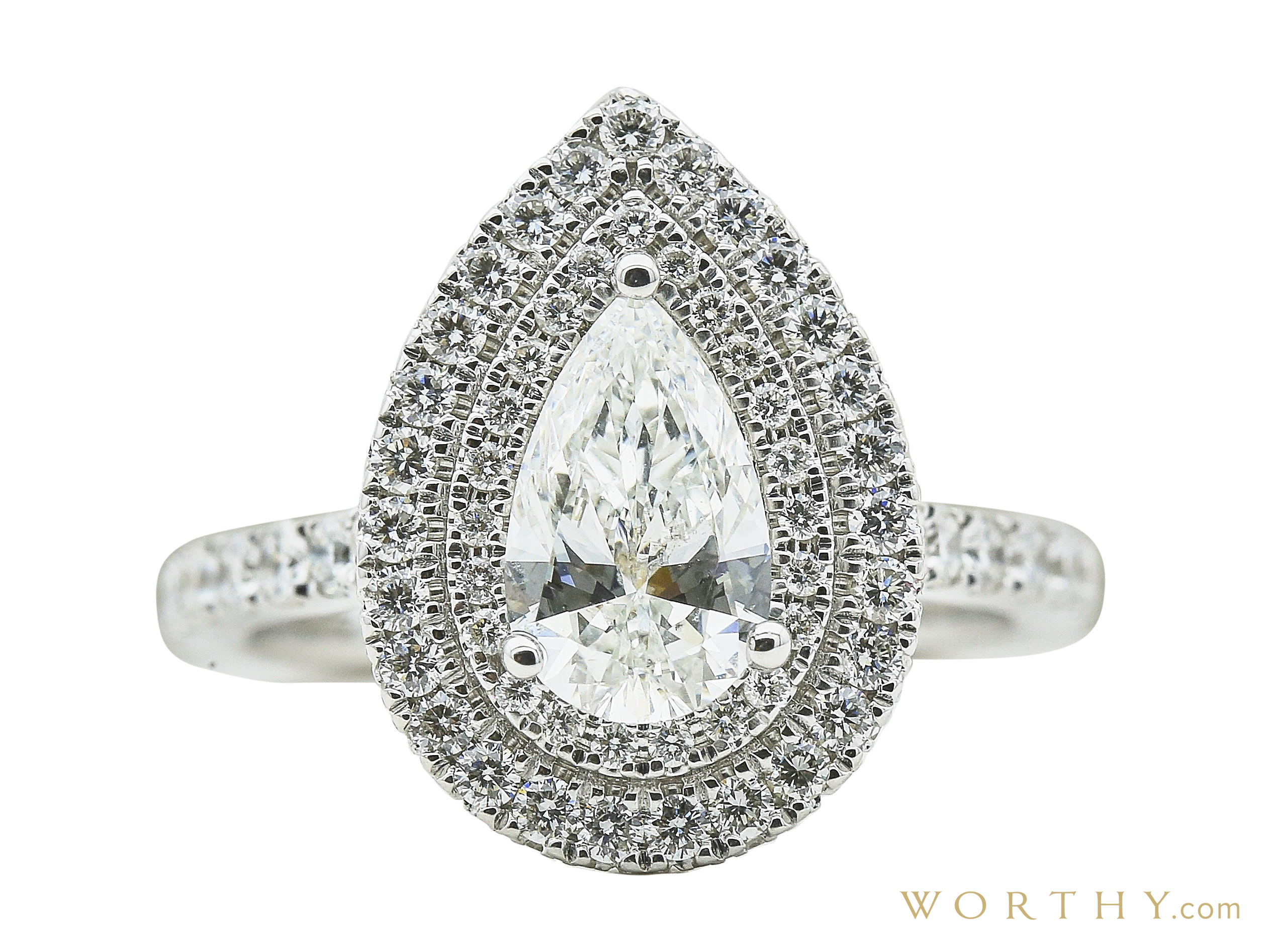 14k gold custom made halo ring consisting of pear shape, natural natural, weighing 1.01 carats, having a F color and SI2 clarity, according to GIA grading scale. All surrounding naturals are genuine with a total carat weight (cttw) of 0.96 carats.