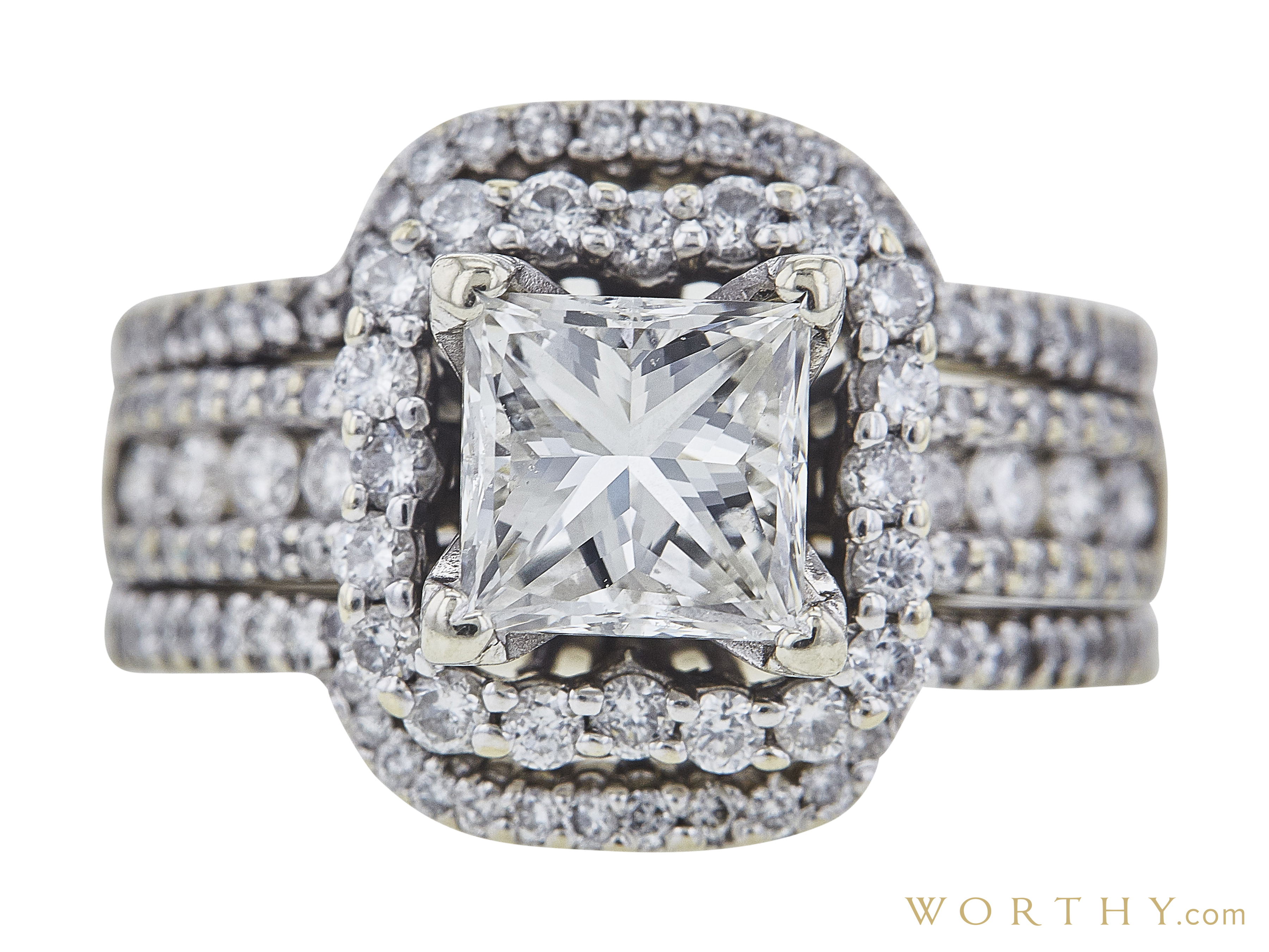 14k gold custom made bridal set ring consisting of princess shape, natural natural, weighing 1.35 - 1.50 carats, having a I-J color and SI1-SI2 clarity, according to GIA grading scale. All surrounding naturals are genuine with a total carat weight (cttw) of 0.88 carats.