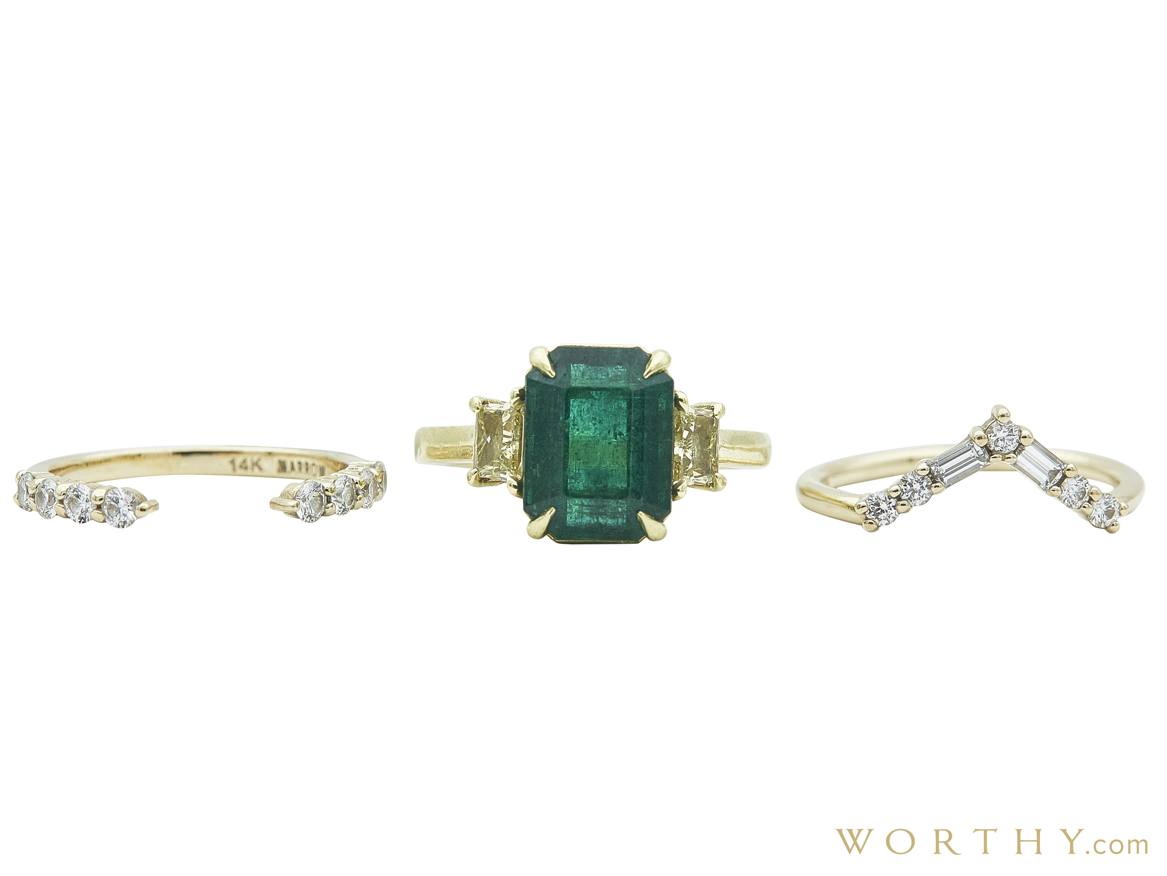 18k gold custom made bridal set ring consisting of emerald shape, natural emerald, weighing 3.75 - 3.90 carats, having a Green color and Highly Included clarity, according to GIA grading scale. All surrounding naturals are genuine with a total carat weight (cttw) of 0.83 carats.