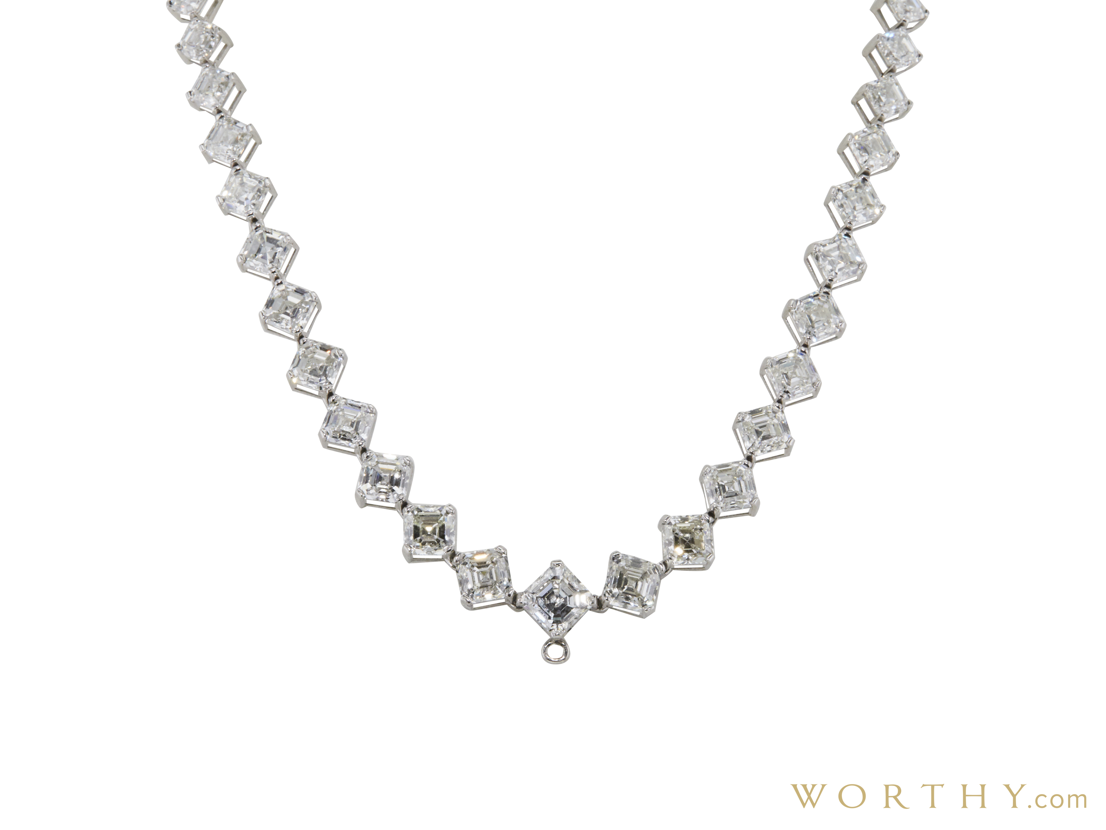 platinum custom made riviera necklace consisting of square emerald shape, natural natural, weighing 2.11 carats, having a I color and VS1 clarity, according to GIA grading scale. The center stone measuring 7.77mm x 7.67mm x 4.56mm and carries a GIA grading report. All surrounding naturals are genuine with a total carat weight (cttw) of 45.24 carats.