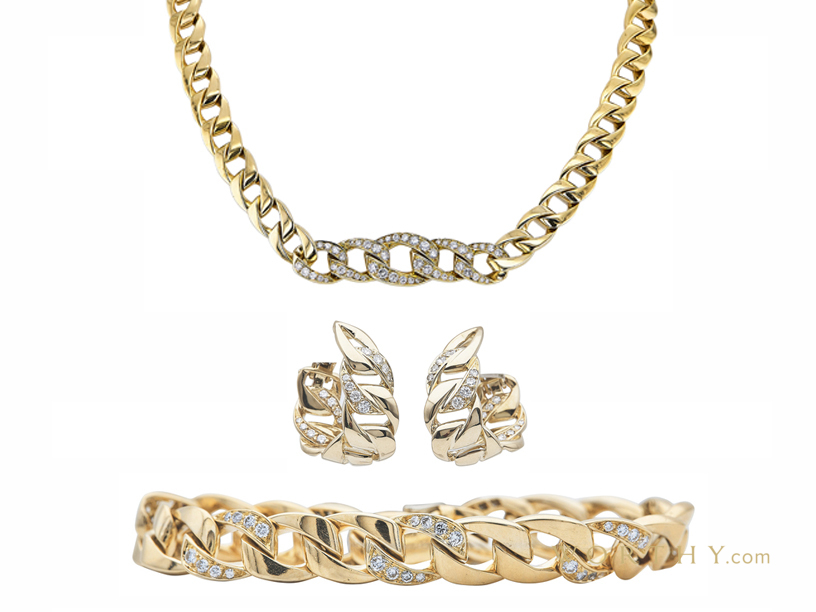 Cartier Curb Chain Link Necklace, Bracelet and Earrings Set With Diamonds 18K Yellow Gold