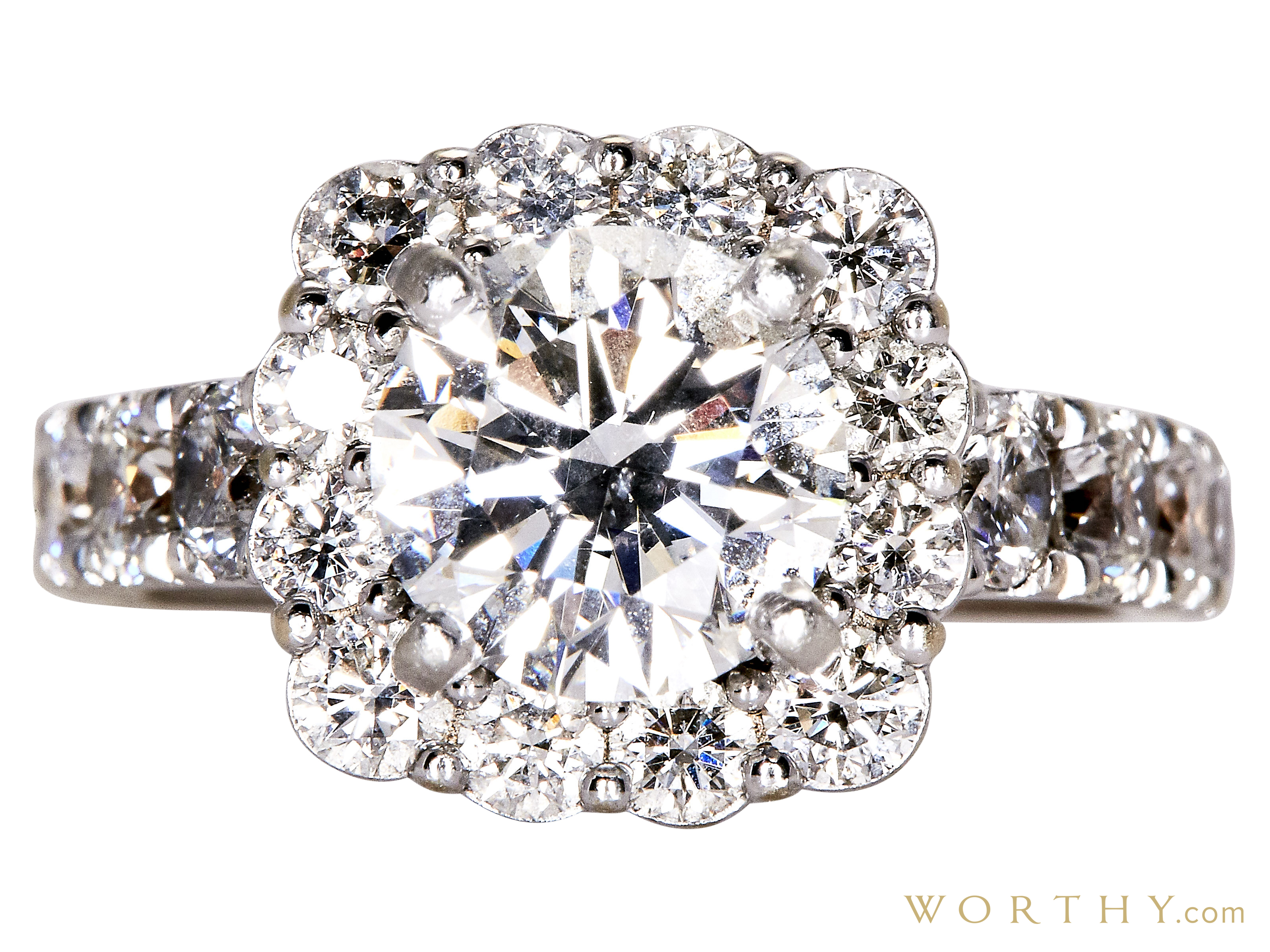 14k gold custom made bridal set ring consisting of round shape, natural natural, weighing 2.07 carats, having a E color and SI2 clarity, according to GIA grading scale. All surrounding naturals are genuine with a total carat weight (cttw) of 2.23 carats.