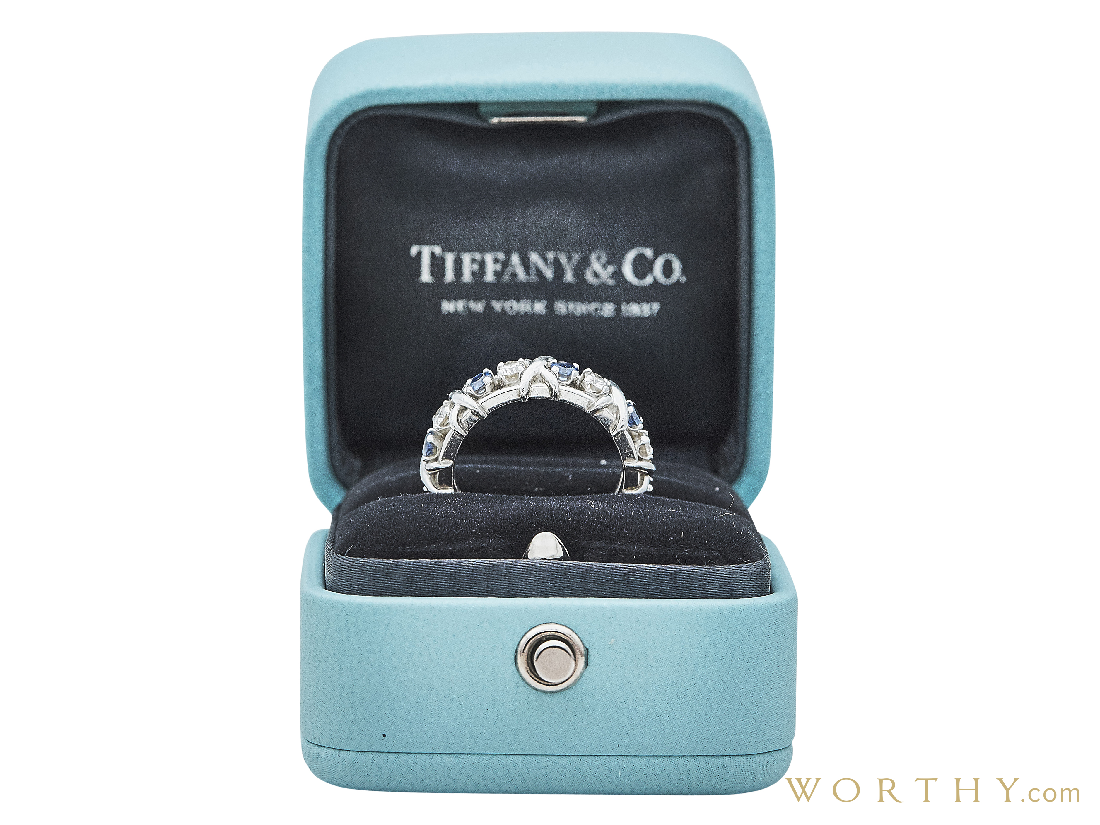 platinum tiffany & co. eternity band ring consisting of8Round shape, natural Naturals, weighing 0.75 - 0.80 carats (cttw). The stones color and clarity ranging G-H and VS1-VS2 respectively, according to GIA grading scale.