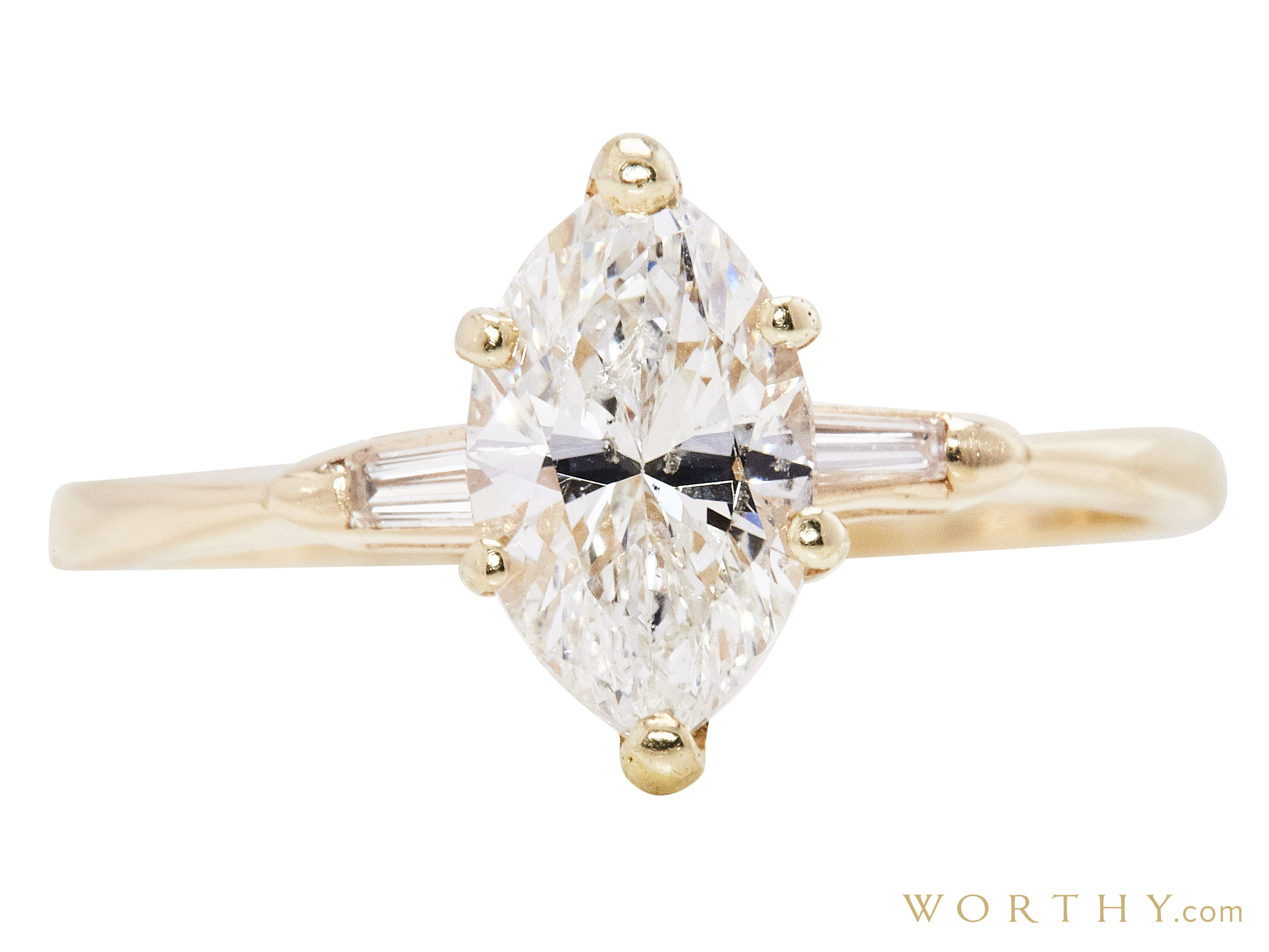 14k gold custom made solitaire ring consisting of marquise shape, natural natural, weighing 1.50 carats, having a G color and I1 clarity, according to GIA grading scale. All surrounding naturals are genuine with a total carat weight (cttw) of 0.06 carats.