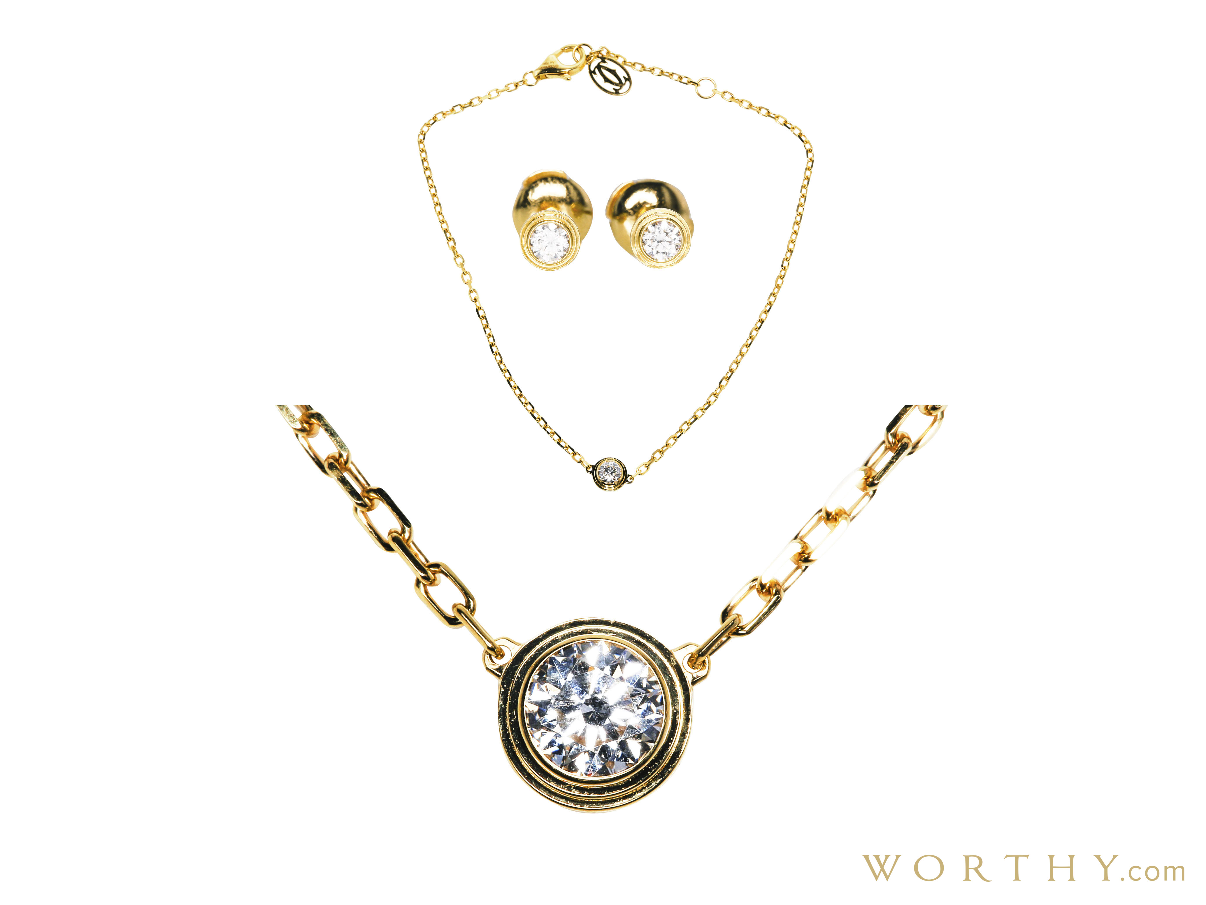 Necklace Stamped: ©CARTIER Au750 NCK311 PGI. Earring posts stamped: ©CARTIER JYD830 Au750 Earring backs stamped: Au750 1801 AL. Bracelet Stamped: ©CARTIER Au750 QVL057 1AR 750. All items come with Original Cartier Box and Certificate. This item was graded at the Worthy Lab by GIA Graduate Gemologists. Gemological findings may vary if the same diamond is evaluated un-mounted. Grade and Carat weights are approximate ranges as permitted by setting, unless clearly specified or hallmarked.