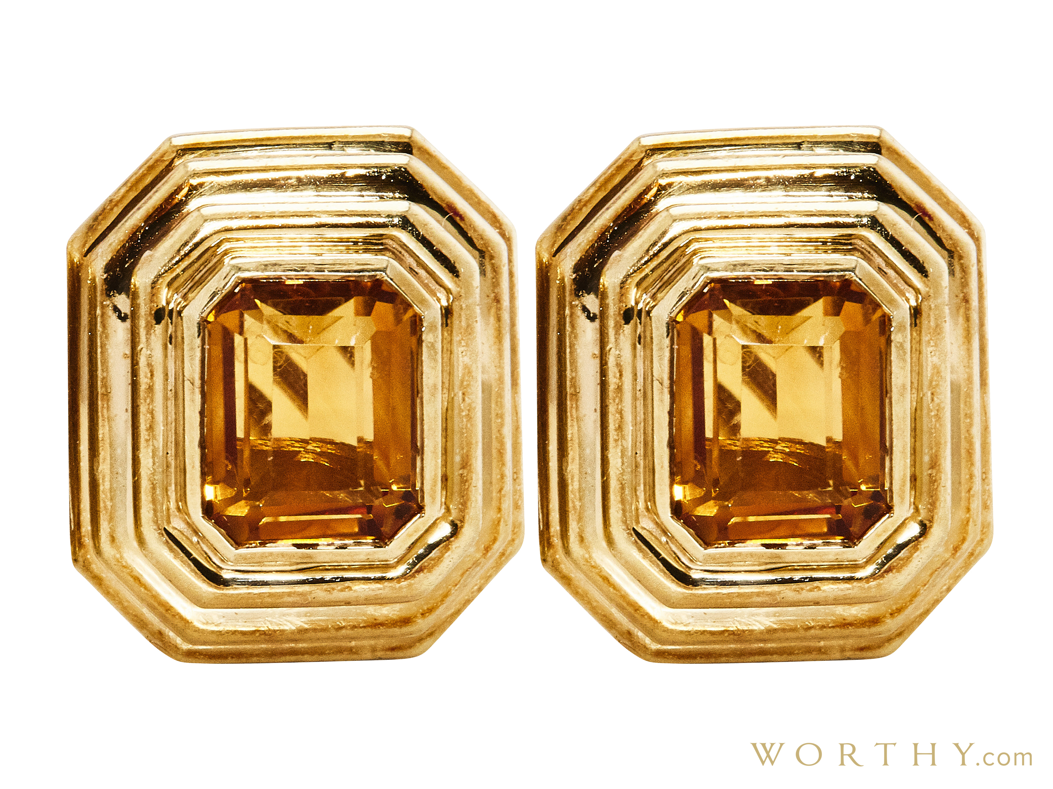 18k gold other other earrings consisting of2Emerald shape, natural Citrines, weighing 5.20 - 5.78 carats (cttw). The stones color and clarity ranging Orange and Very Slightly Included respectively, according to GIA grading scale.