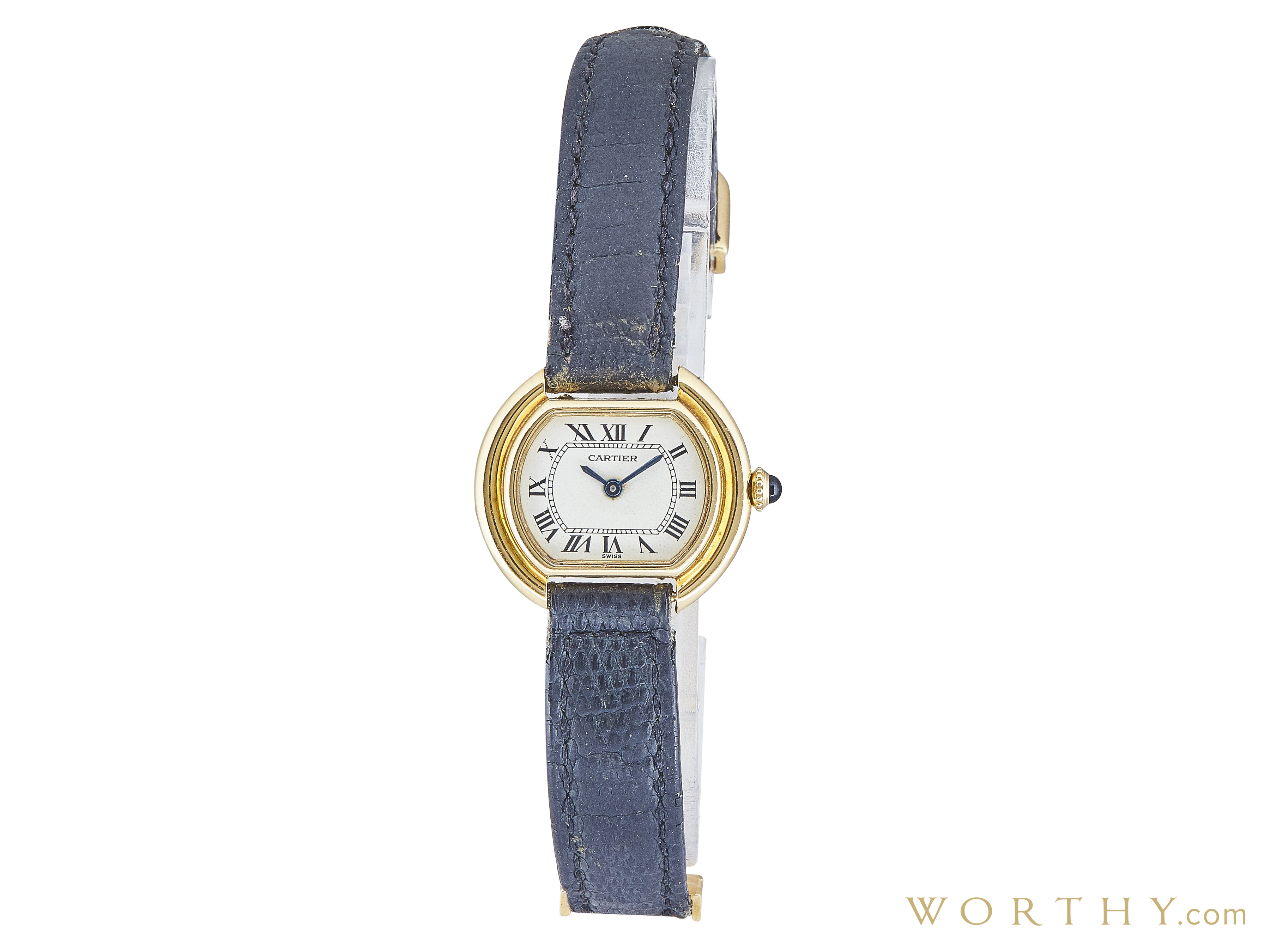 This Cartier Ellipse was auctioned at Worthy. The woman's watch is 26.5mm in diameter with Yellow Gold case, Leather band. It features complication and hand-winding movement. It is in very good condition and attracted 193 buyers.