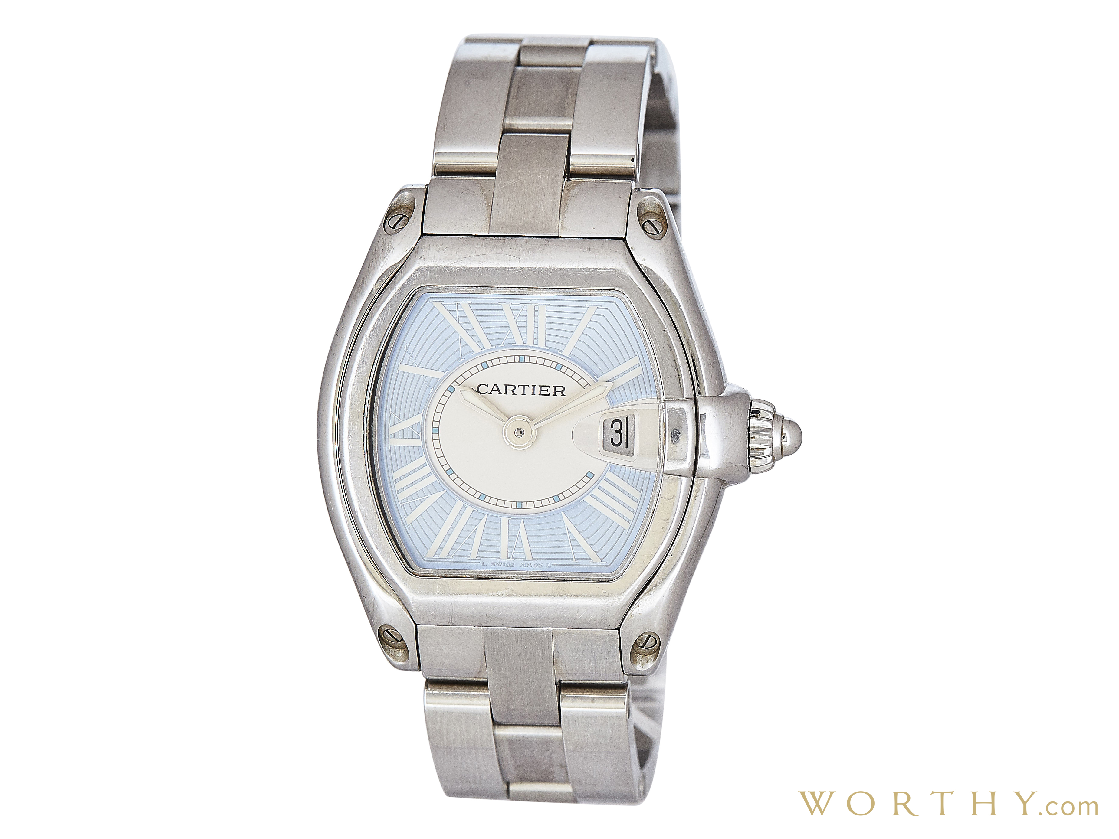 This Cartier Roadster was auctioned at Worthy. The unisex's watch is 30mm in diameter with Stainless Steel case, Stainless Steel band. It features Date complication and quartz movement. It is in good condition and attracted 526 buyers.