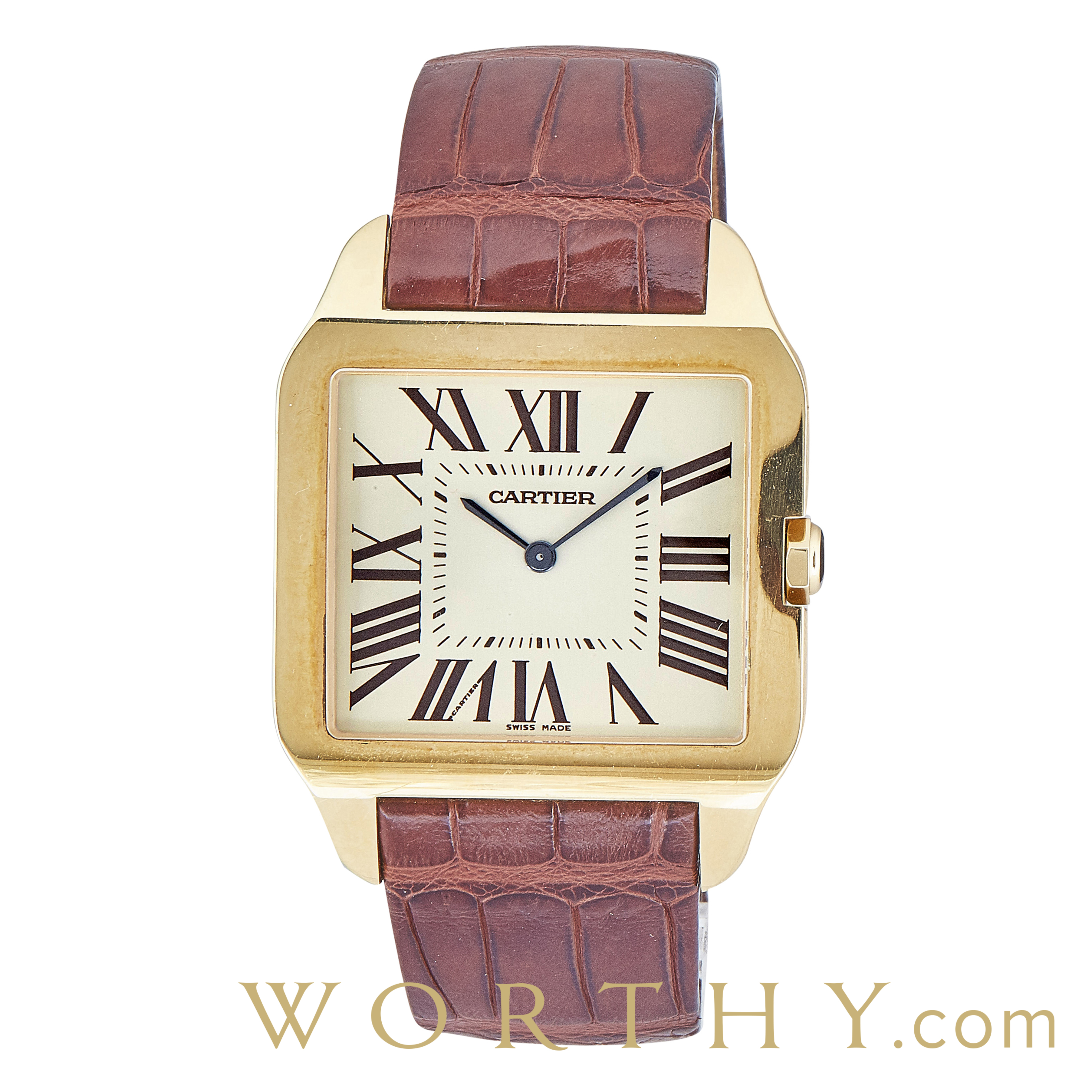 This Cartier Santos-Dumont was auctioned at Worthy. The 's watch is 35mm in diameter with Yellow Gold case, Leather band. It features complication and hand-winding movement. It is in very good condition and attracted 217 buyers.