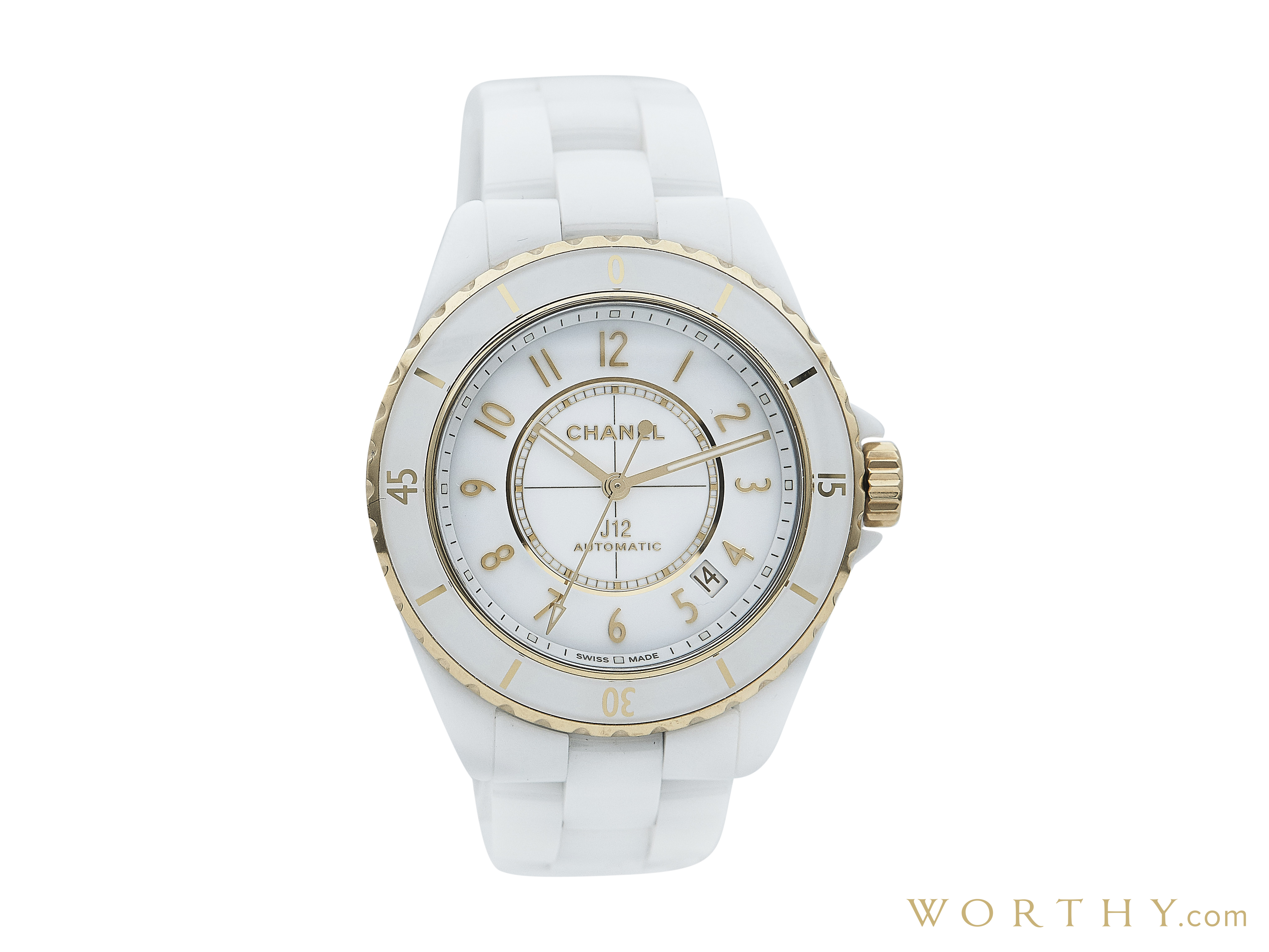 This Chanel J12 was auctioned at Worthy. The woman's watch is 38mm in diameter with Ceramic case, Ceramic band. It features Date complication and automatic movement. It is in excellent condition and attracted 484 buyers.