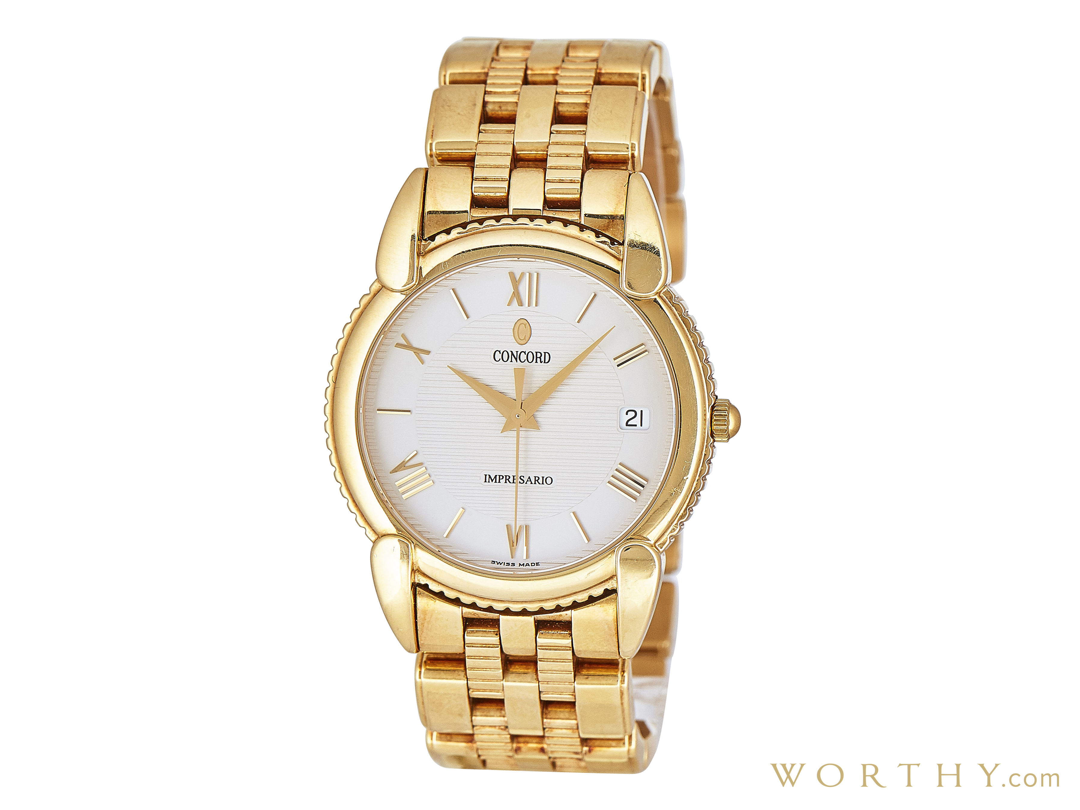 This Concord Impresario was auctioned at Worthy. The unisex's watch is 35mm in diameter with Yellow Gold case, Yellow Gold band. It features Date complication and quartz movement. It is in good condition and attracted 288 buyers.