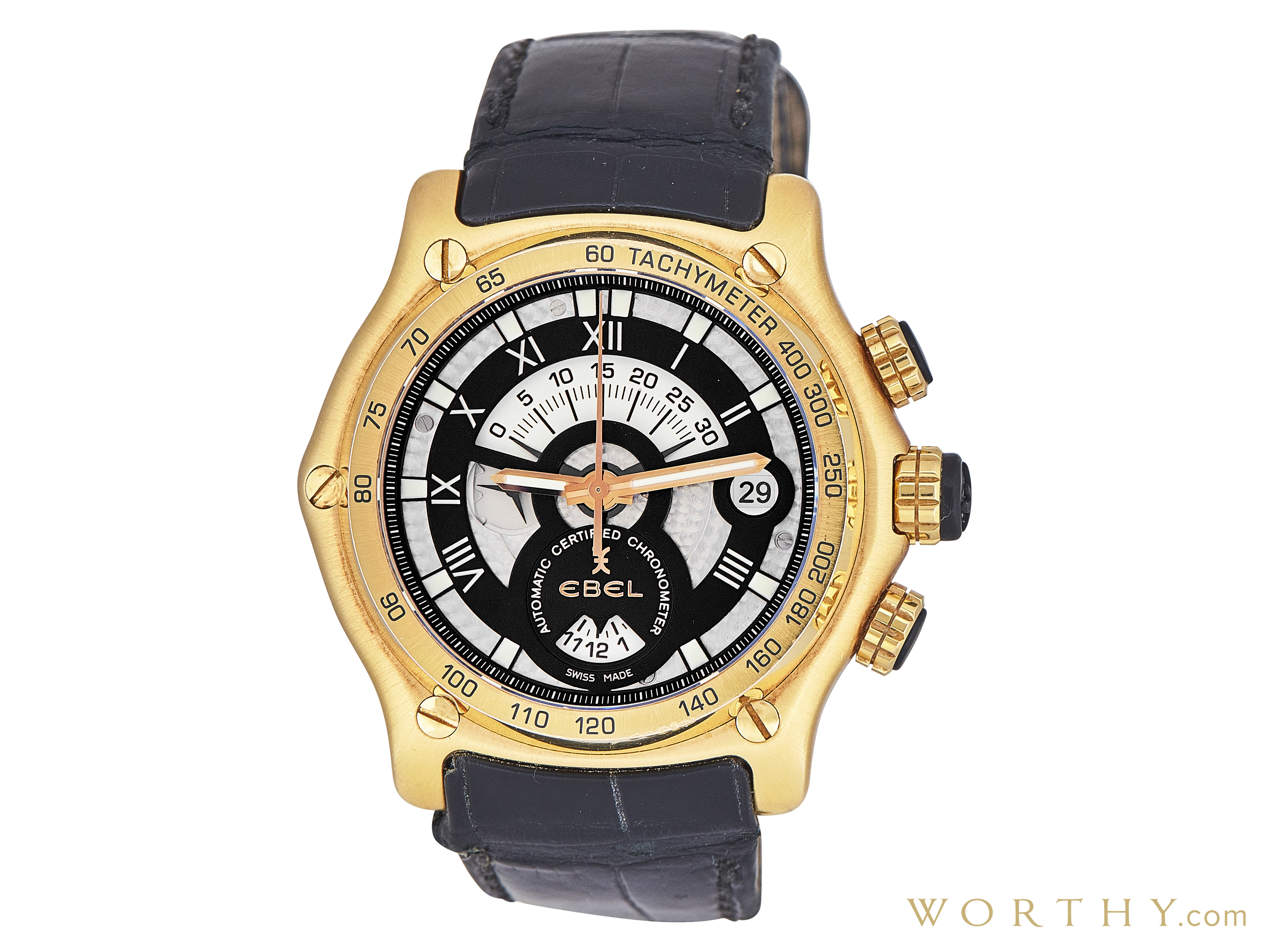 This Ebel Ebel 1911 BTR was auctioned at Worthy. The unisex's watch is 44mm in diameter with Yellow Gold case, Leather band. It features Date, Chronograph complication and automatic movement. It is in very good condition and attracted 351 buyers.