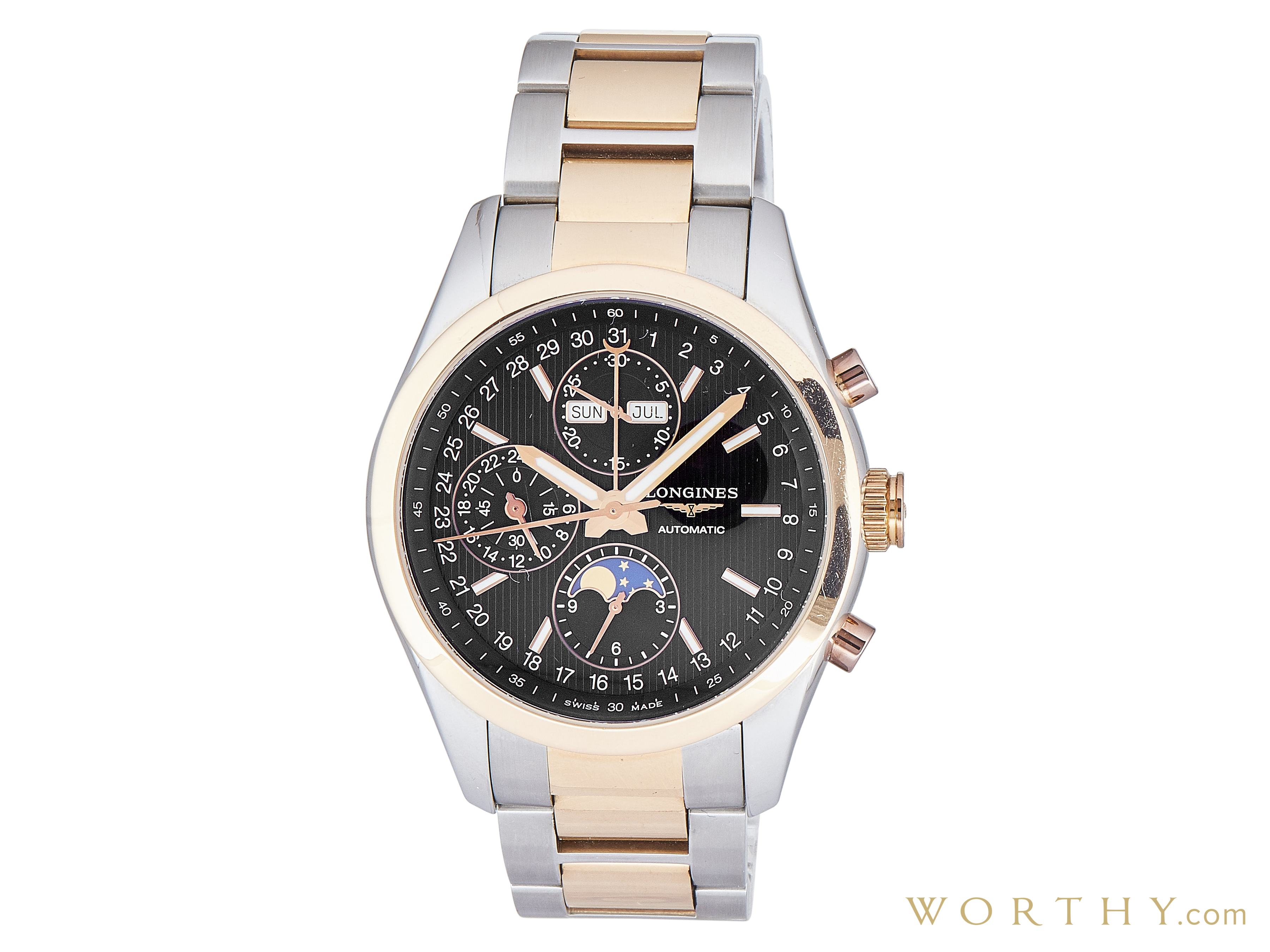 This Longines Conquest Classic was auctioned at Worthy. The 's watch is 42mm in diameter with Steel and Gold case, Steel and Gold band. It features Day, Date, Month, Chronograph, Moonphase complication and automatic movement. It is in very good condition and attracted 497 buyers.