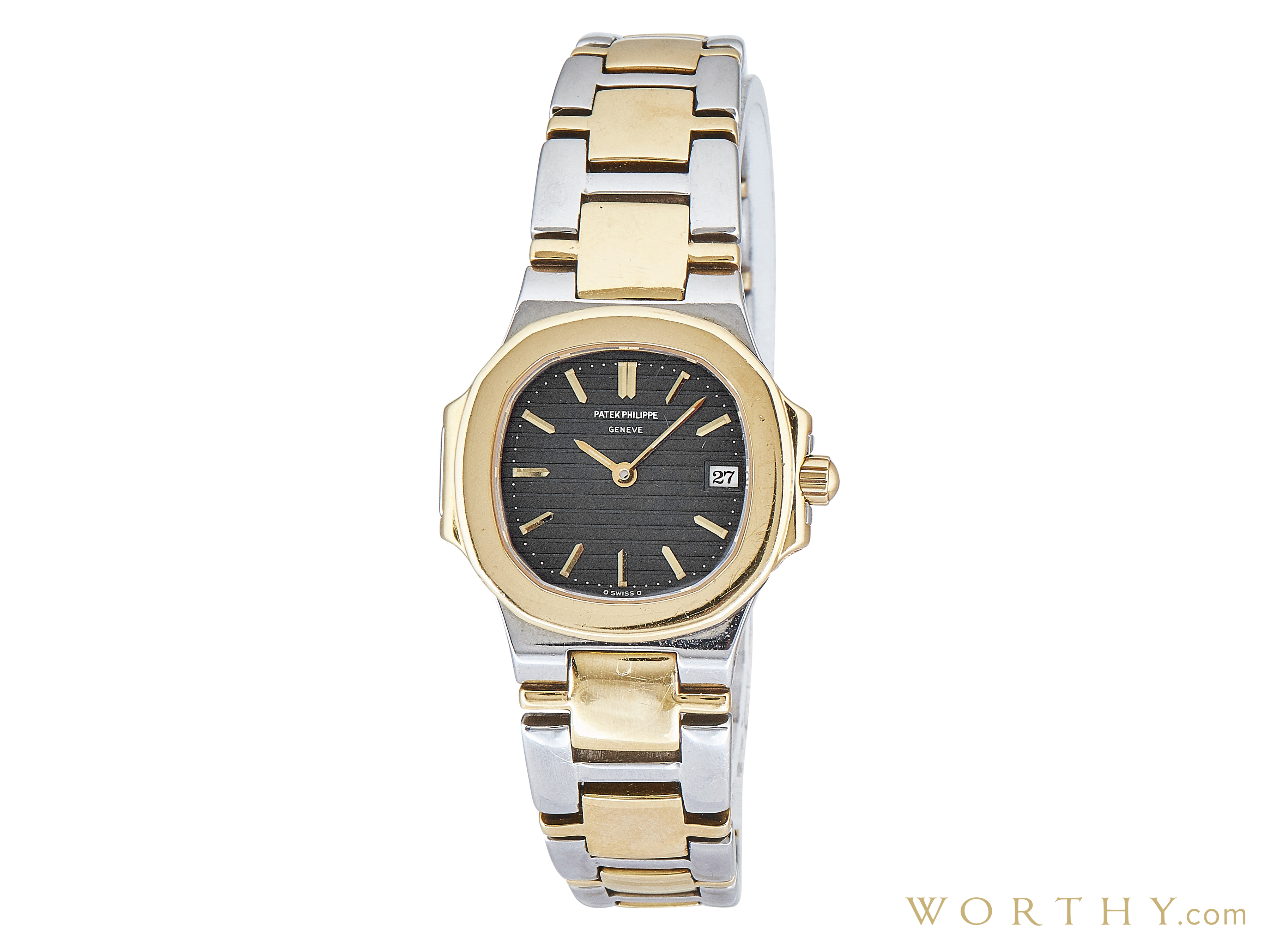 This Patek Philippe Nautilus was auctioned at Worthy. The woman's watch is 26.5mm in diameter with Steel and Gold case, Steel and Gold band. It features Date complication and quartz movement. It is in very good condition and attracted 362 buyers.
