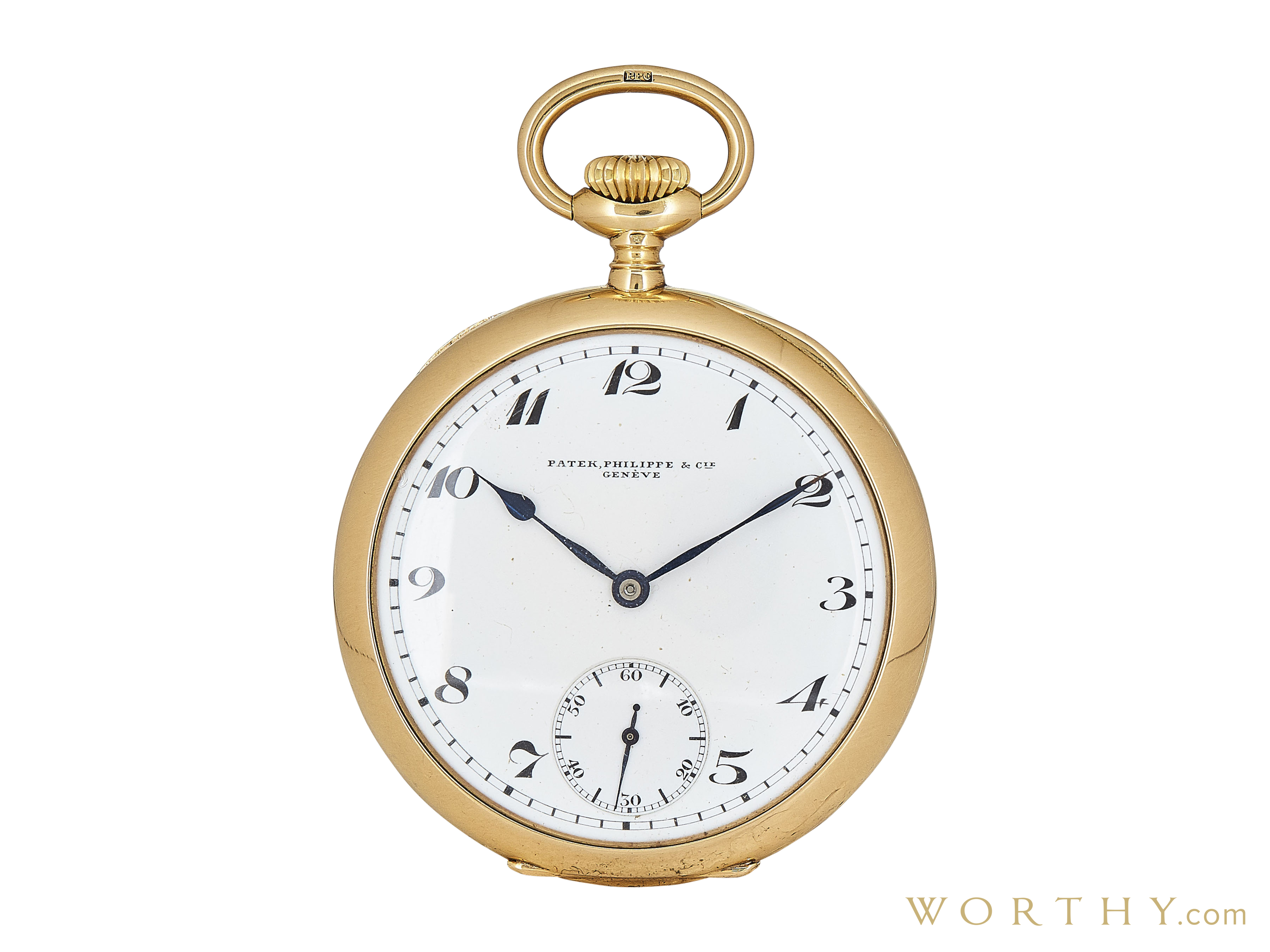 This Patek Philippe Pocket watch was auctioned at Worthy. The man's watch is 40mm in diameter with Yellow Gold case, None band. It features complication and hand-winding movement. It is in good condition and attracted 421 buyers.