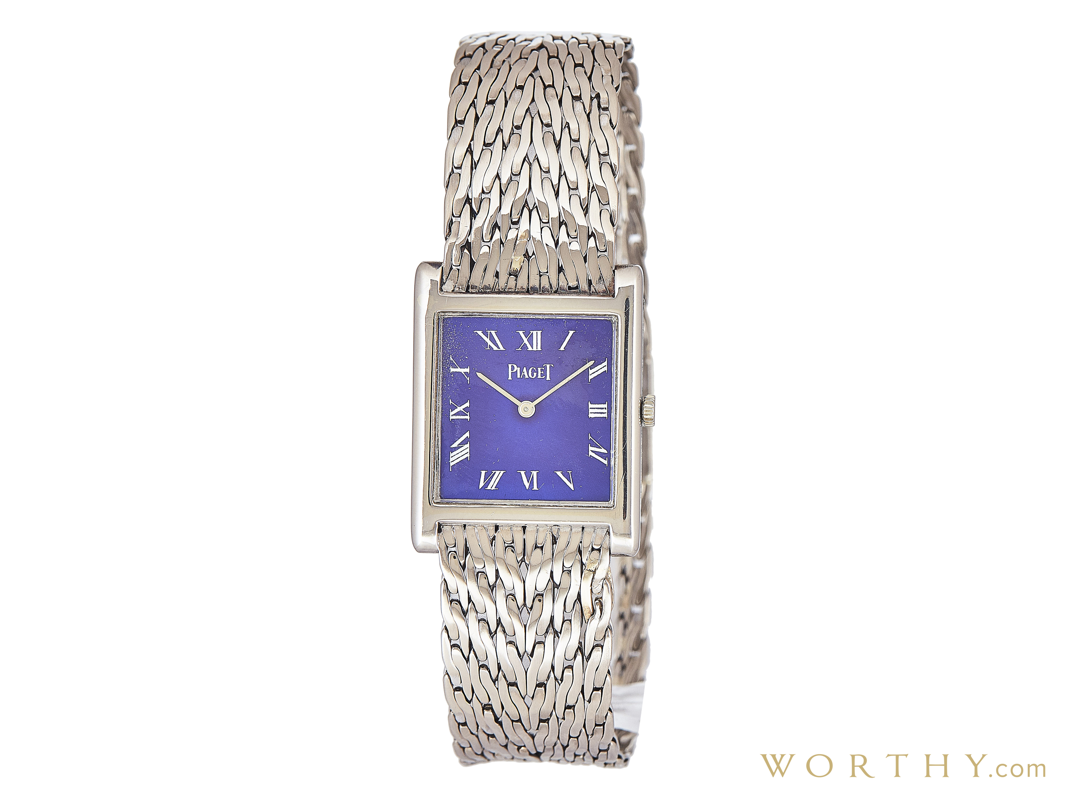 This Piaget was auctioned at Worthy. The woman's watch is 23mm in diameter with White Gold case, White Gold band. It features complication and hand-winding movement. It is in good condition and attracted 289 buyers.