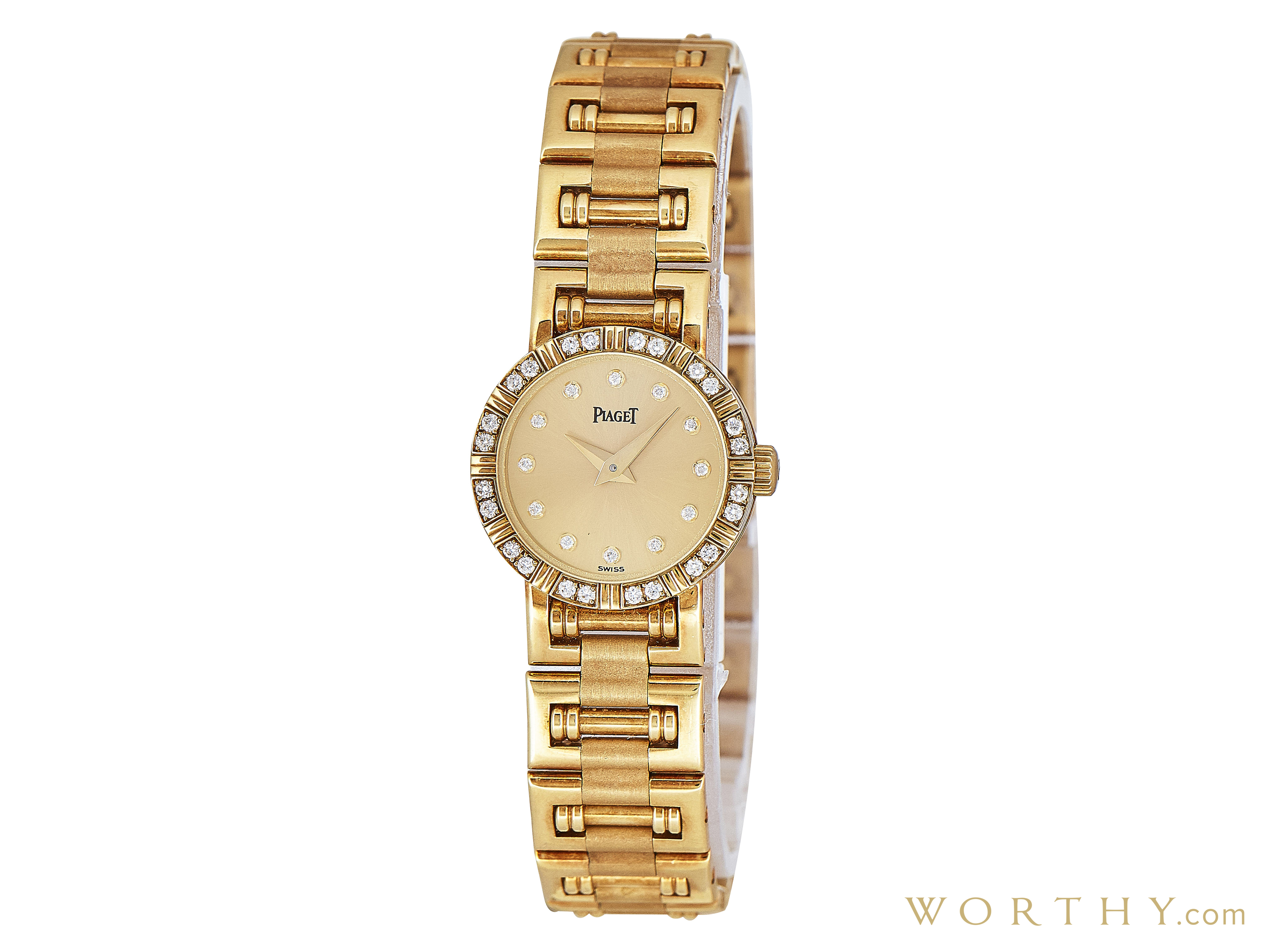 This Piaget Dancer was auctioned at Worthy. The woman's watch is 19mm in diameter with Yellow Gold case, Yellow Gold band. It features complication and quartz movement. It is in very good condition and attracted 311 buyers.
