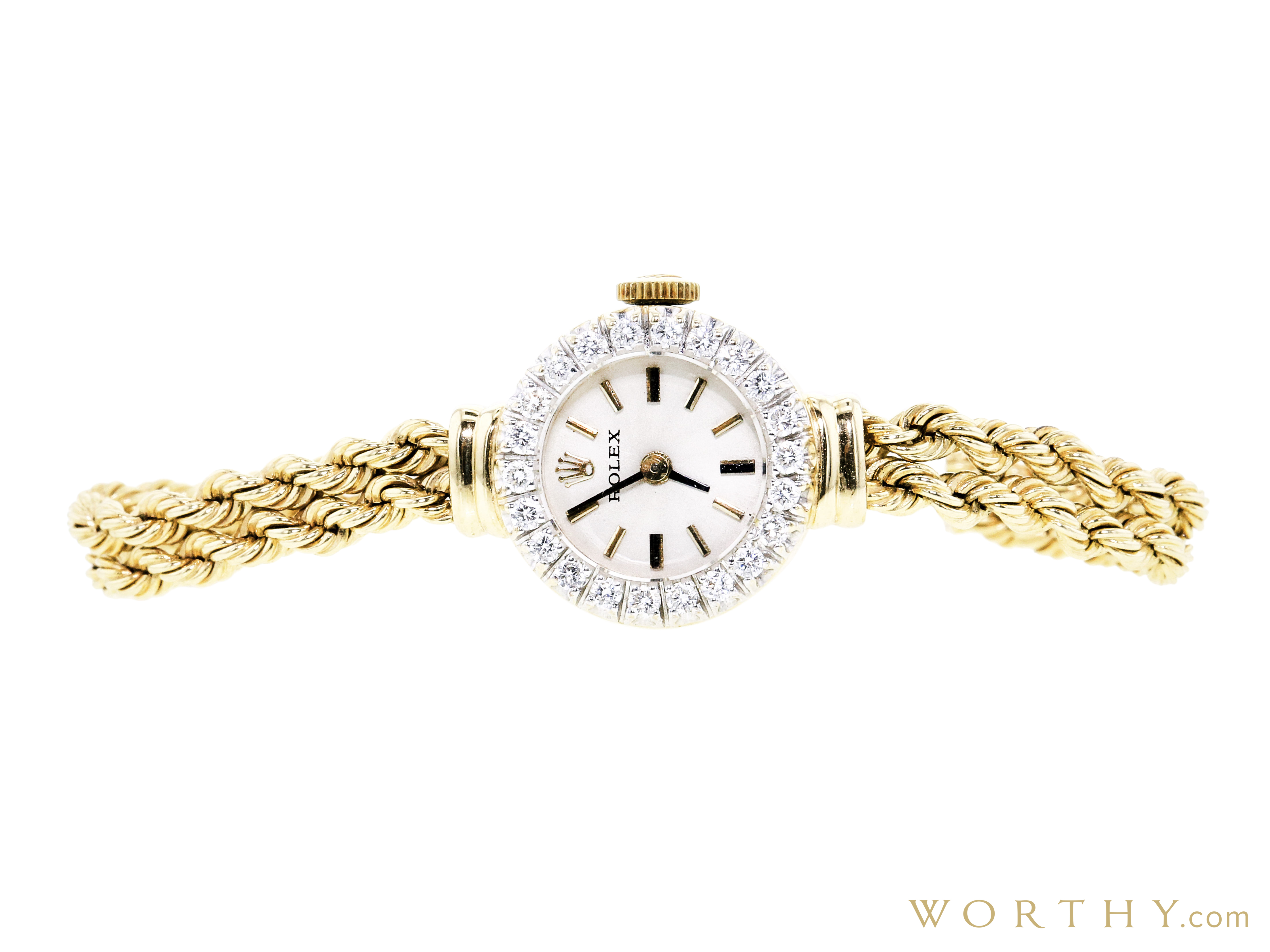 This Rolex 8418 was auctioned at Worthy. The woman's watch is 17mm in diameter with Yellow Gold case, Yellow Gold band. It features complication and hand-winding movement. It is in good condition and attracted 180 buyers.