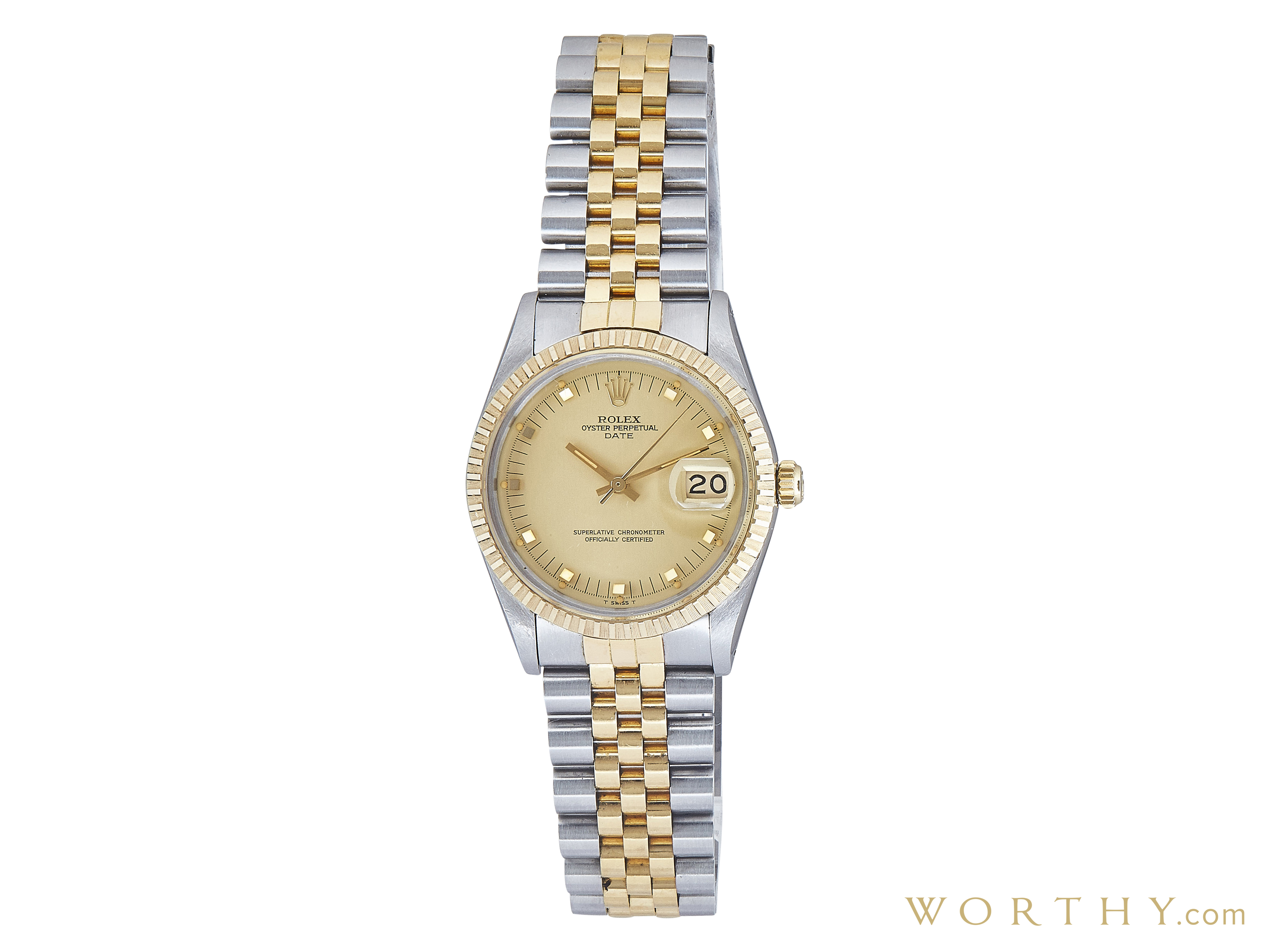 This Rolex Date was auctioned at Worthy. The 's watch is 36mm in diameter with Steel and Gold case, Steel and Gold band. It features Date complication and automatic movement. It is in very good condition and attracted 546 buyers.