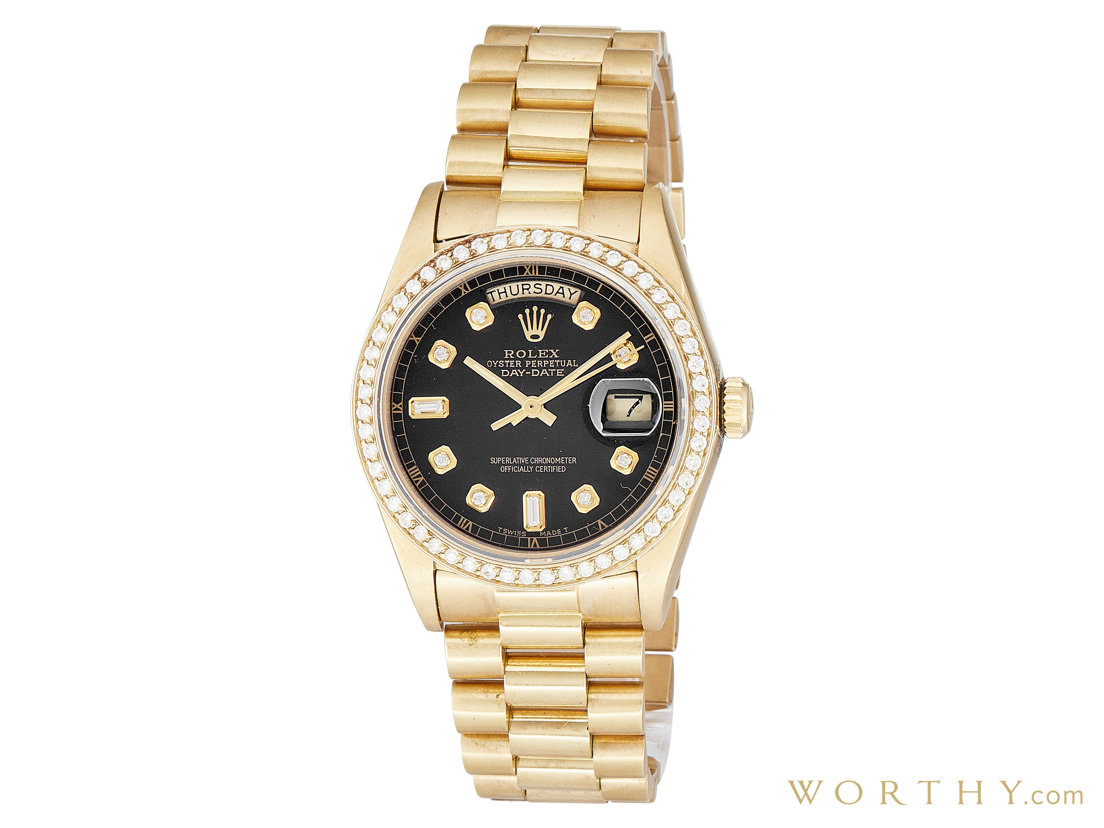 This Rolex Day-Date was auctioned at Worthy. The unisex's watch is 36mm in diameter with Yellow Gold case, Yellow Gold band. It features Day, Date complication and automatic movement. It is in very good condition and attracted 366 buyers.