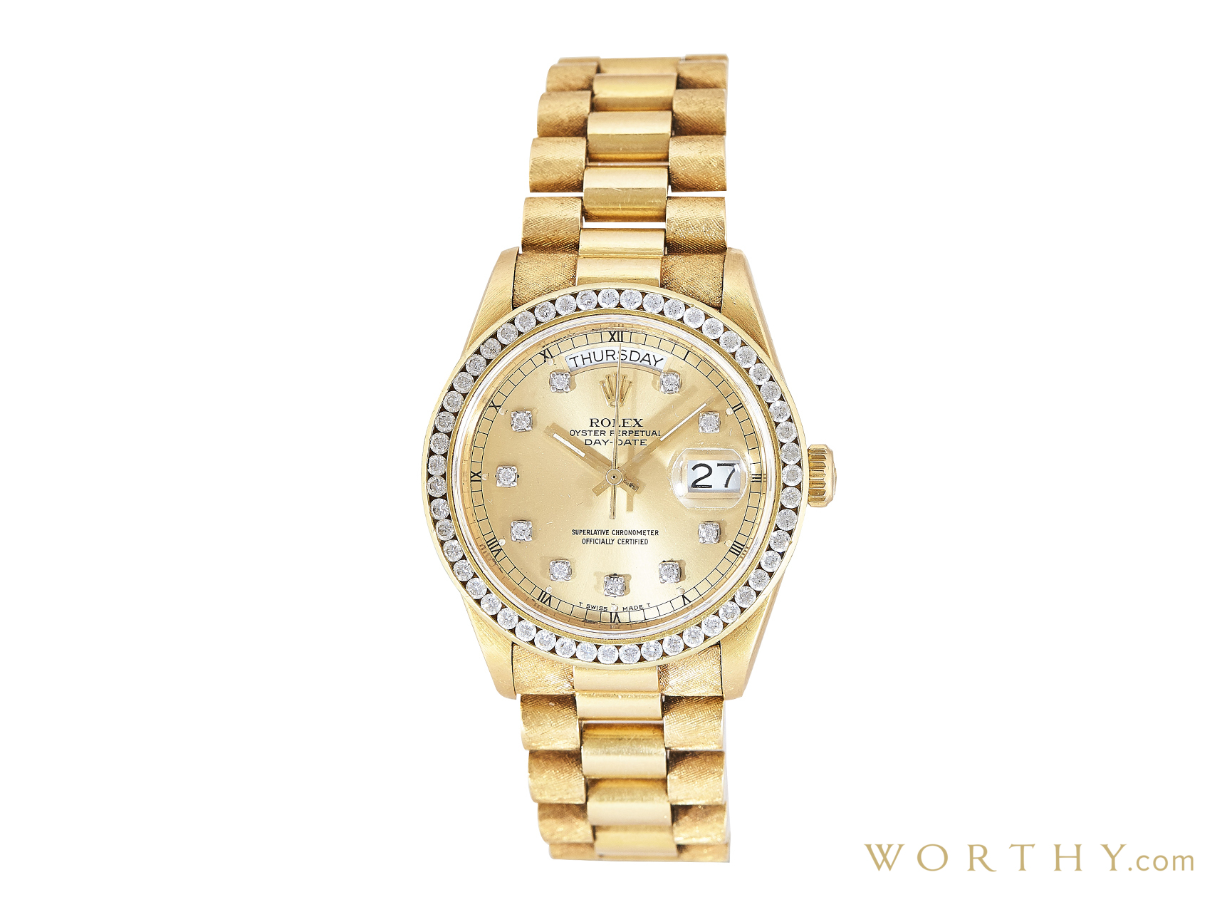 This Rolex Day-Date was auctioned at Worthy. The unisex's watch is 36mm in diameter with Yellow Gold case, Yellow Gold band. It features Day, Date complication and automatic movement. It is in very good condition and attracted 289 buyers.
