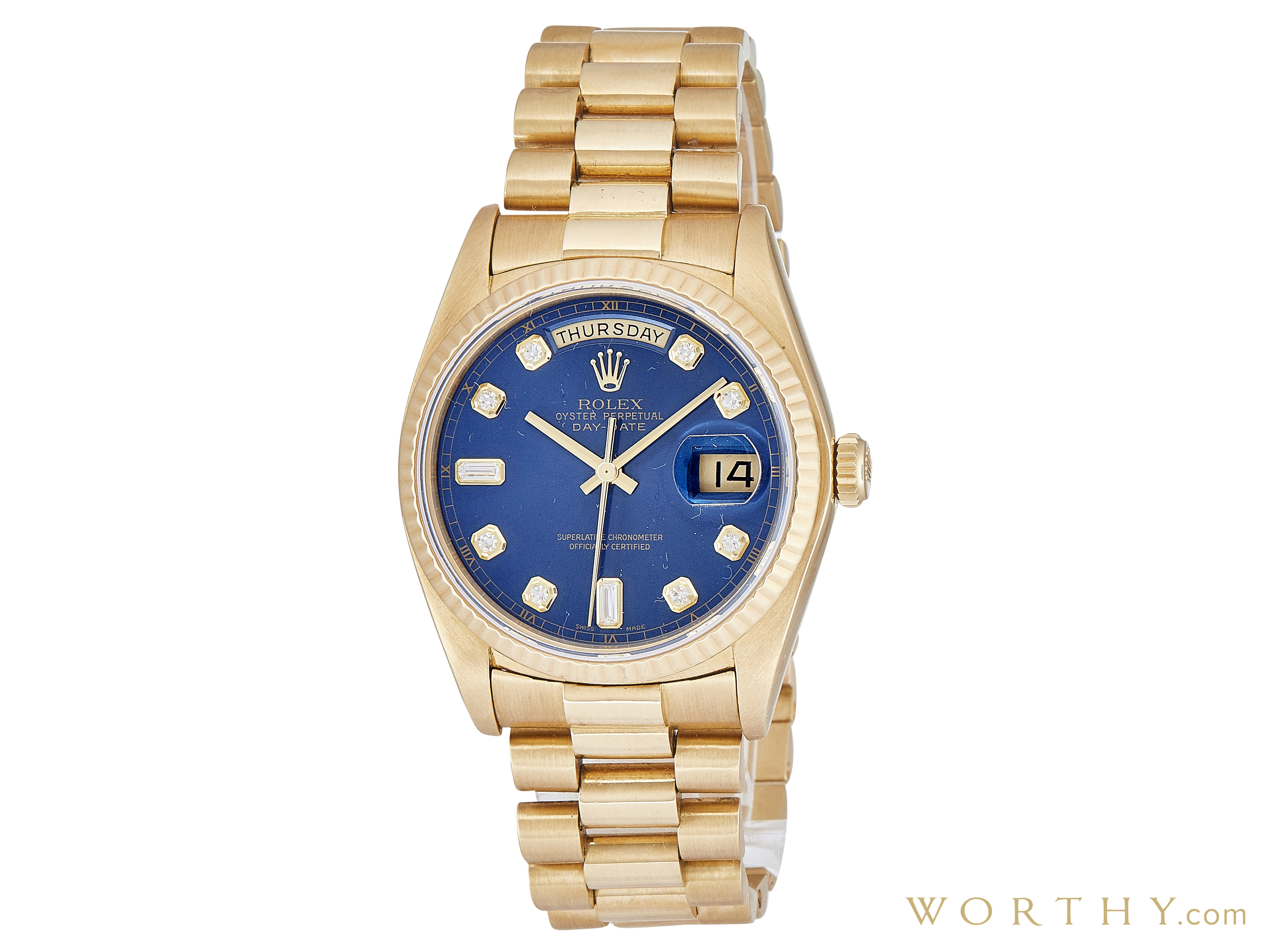 This Rolex Day-Date was auctioned at Worthy. The 's watch is 36mm in diameter with Yellow Gold case, Yellow Gold band. It features Day, Date complication and automatic movement. It is in very good condition and attracted 363 buyers.