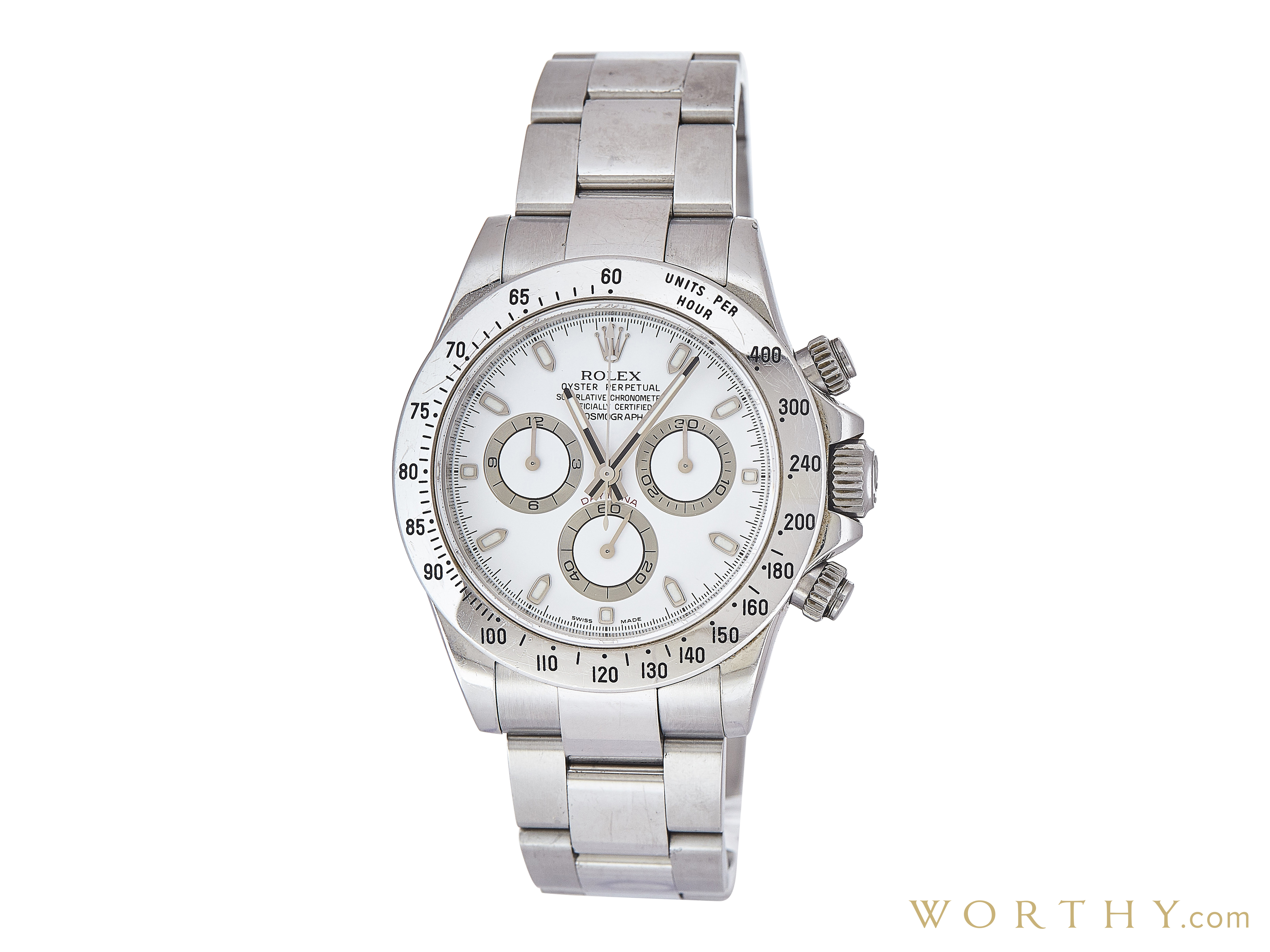 This Rolex Daytona was auctioned at Worthy. The unisex's watch is 40mm in diameter with Stainless Steel case, Stainless Steel band. It features Chronograph complication and automatic movement. It is in very good condition and attracted 440 buyers.