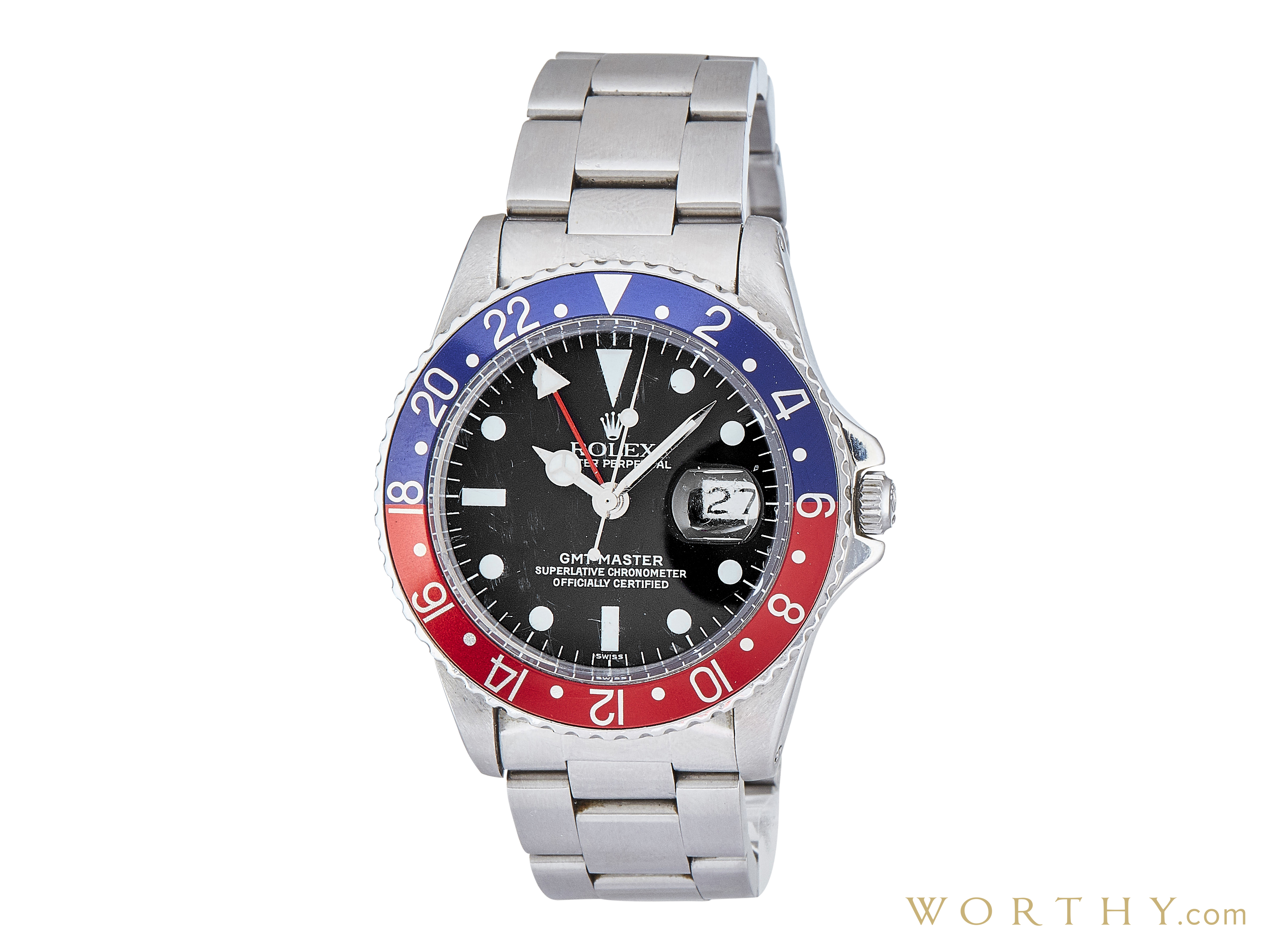 This Rolex GMT-Master was auctioned at Worthy. The 's watch is 40mm in diameter with Stainless Steel case, Stainless Steel band. It features Date, Dual Time-Zone complication and automatic movement. It is in very good condition and attracted 369 buyers.