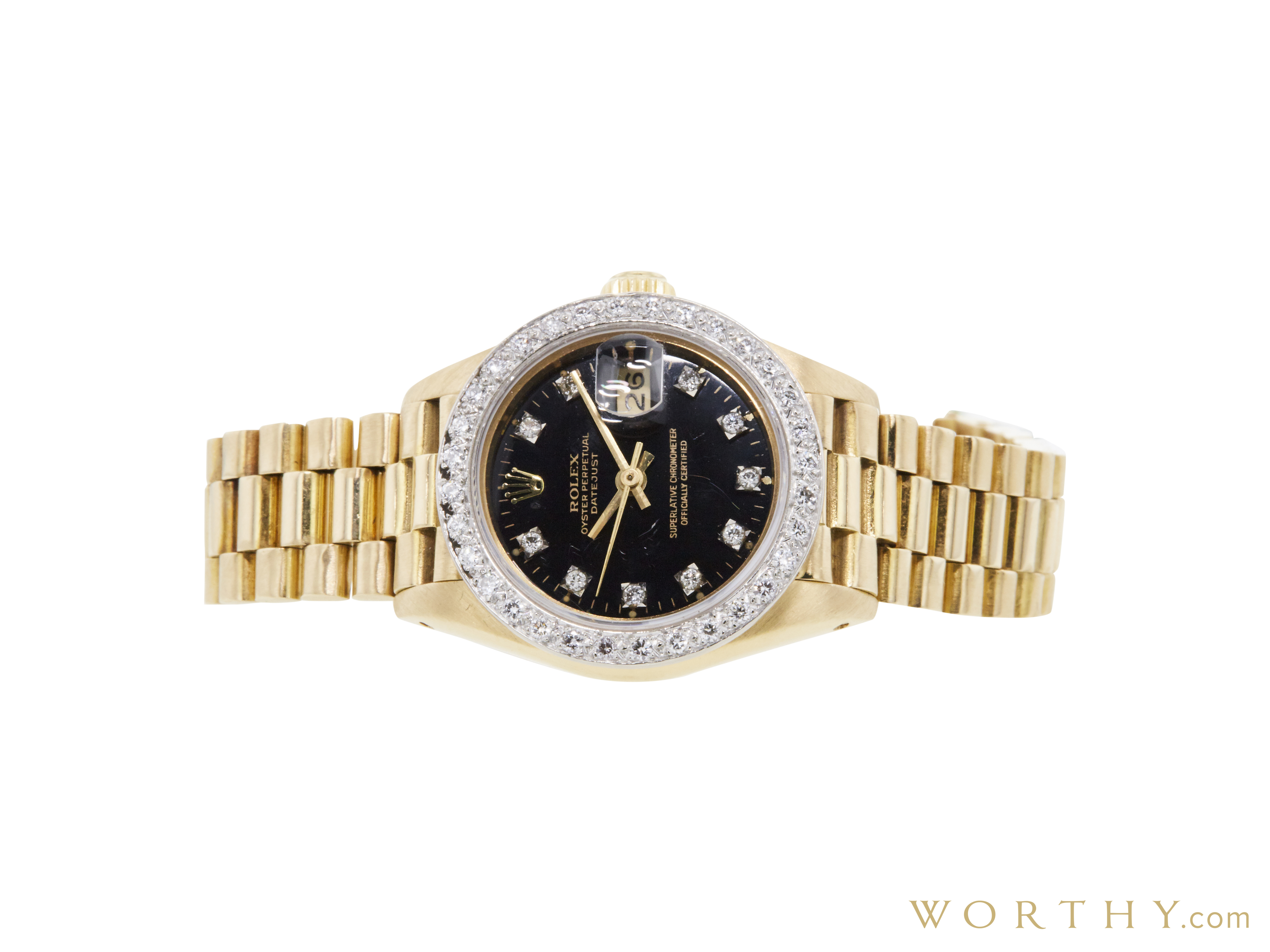 This Rolex 69178 was auctioned at Worthy. The woman's watch is 26mm in diameter with Yellow Gold case, Yellow Gold band. It features complication and automatic movement. It is in fair condition and attracted 251 buyers.