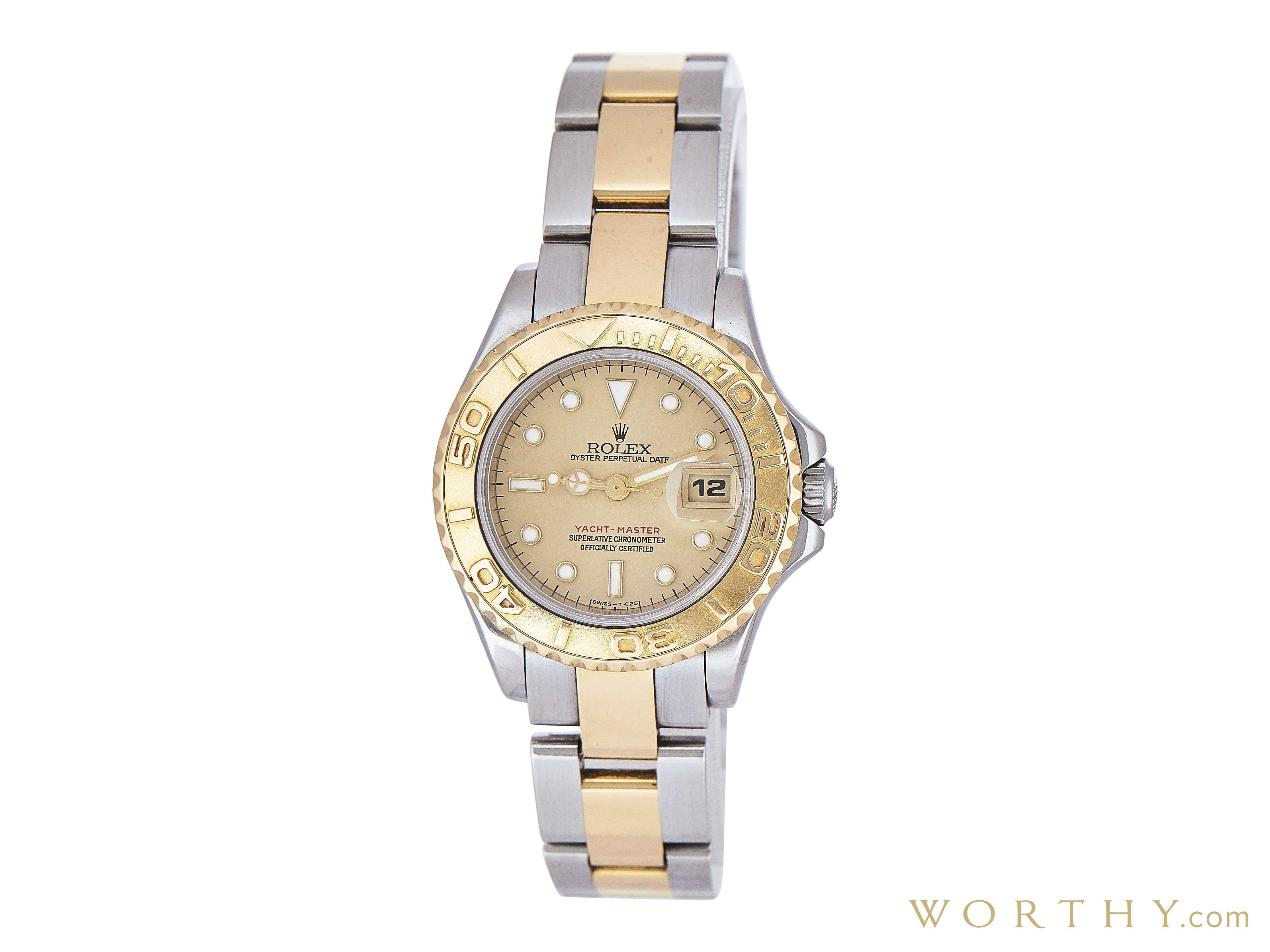 This Rolex Yacht-Master was auctioned at Worthy. The woman's watch is 29mm in diameter with Steel and Gold case, Steel and Gold band. It features Date complication and automatic movement. It is in very good condition and attracted 479 buyers.