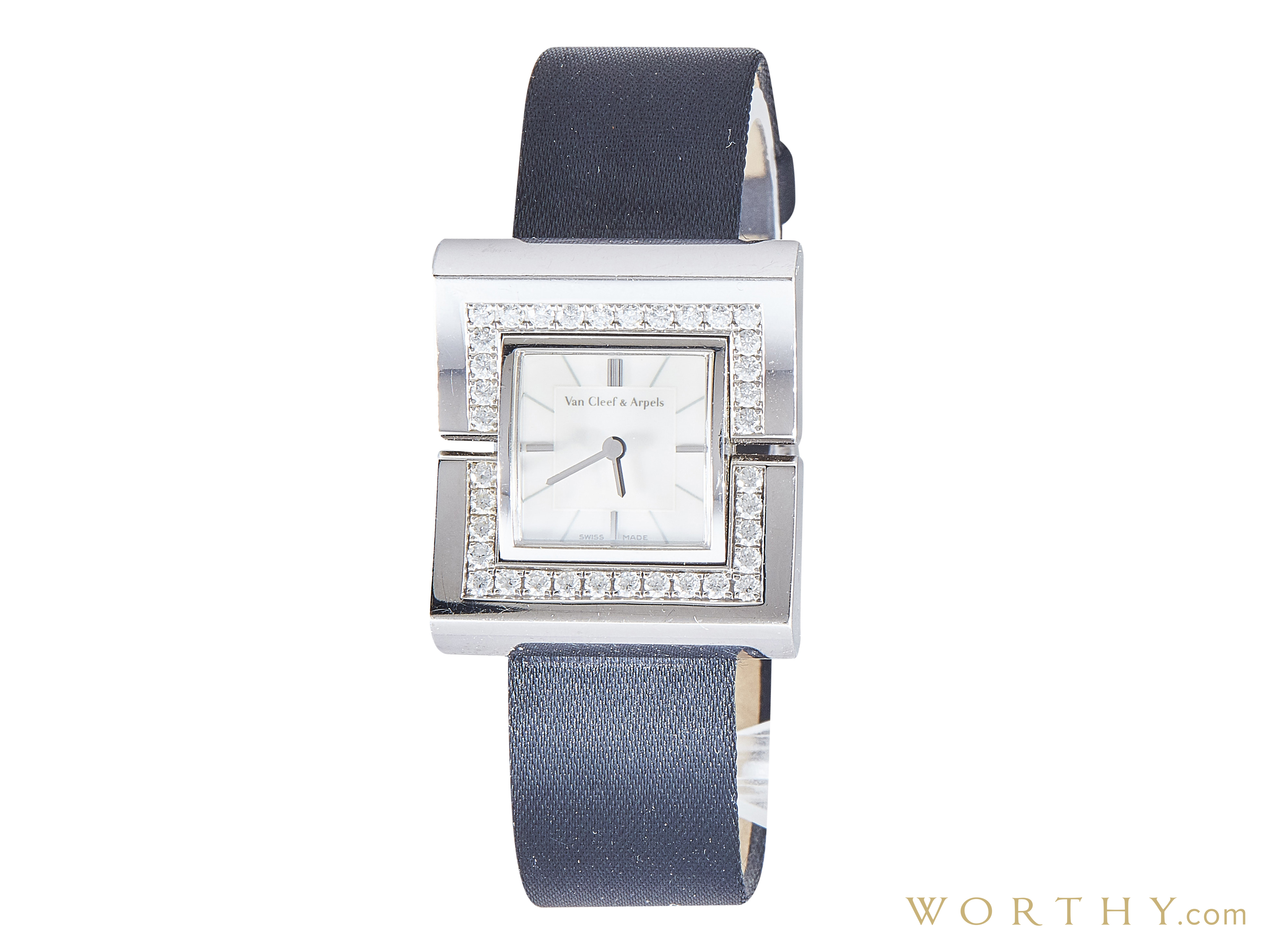 This Van Cleef & Arpels was auctioned at Worthy. The woman's watch is 24mm in diameter with White Gold case, band. It features complication and quartz movement. It is in good condition and attracted 372 buyers.